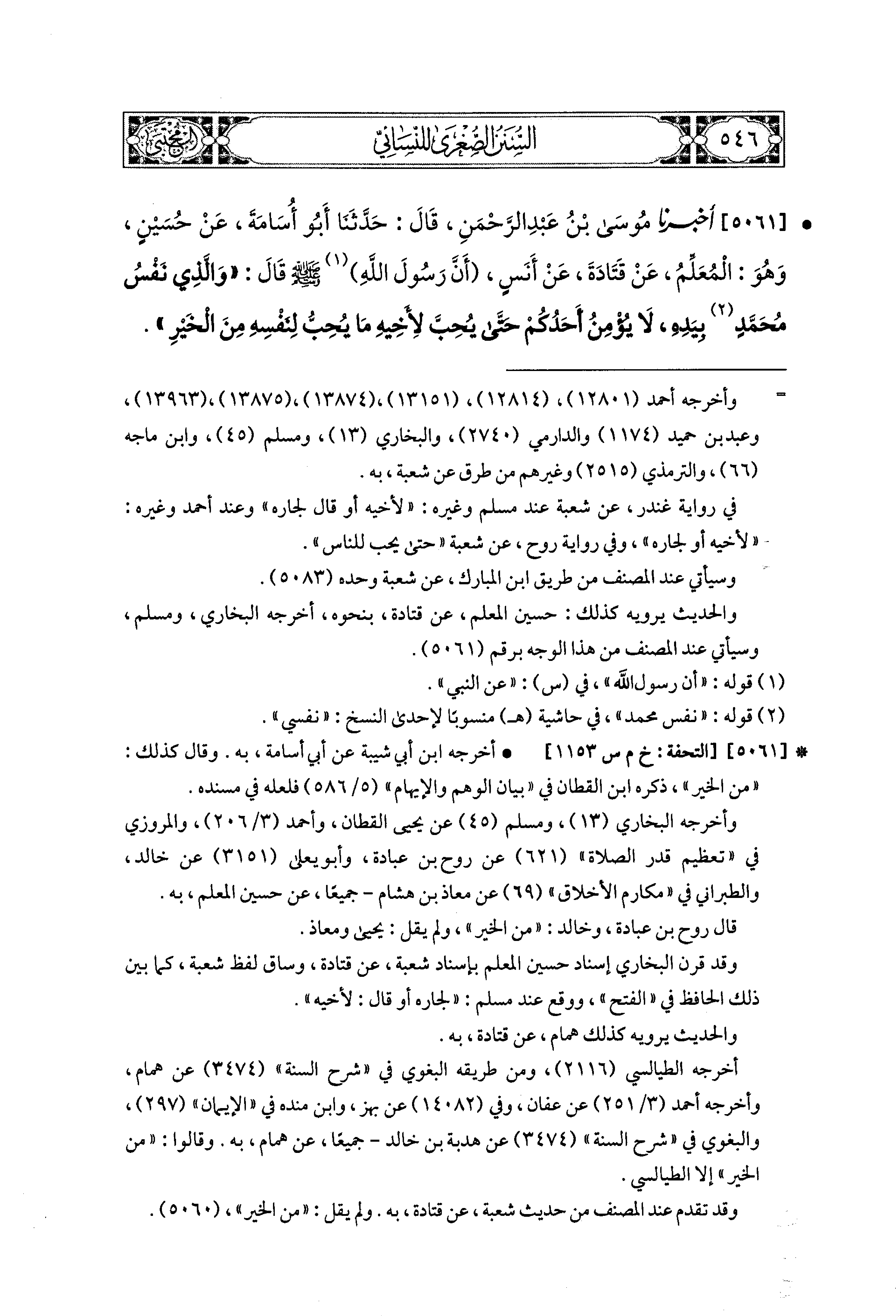 5061- أَخبَرَنا مُوسَى بْنُ عَبدِ الرَّحمَنِ، قال: حَدثنا أَبو أُسَامَةَ، عَن حُسَيْنٍ، وَهُوَ المُعَلِّمُ، عَن قَتَادَةَ، عَن أَنَسٍ، أَنَّ رَسُولَ اللهِ صَلى الله عَليه وسَلم قَالَ: وَالَّذِي نَفْسُ مُحَمدٍ بِيَدِهِ، لاَ يُؤْمِنُ أَحَدُكُمْ حَتَّى يُحِبَّ لأَخِيهِ مَا يُحِبُّ لِنَفْسِهِ مِنَ الخَيْرِ.