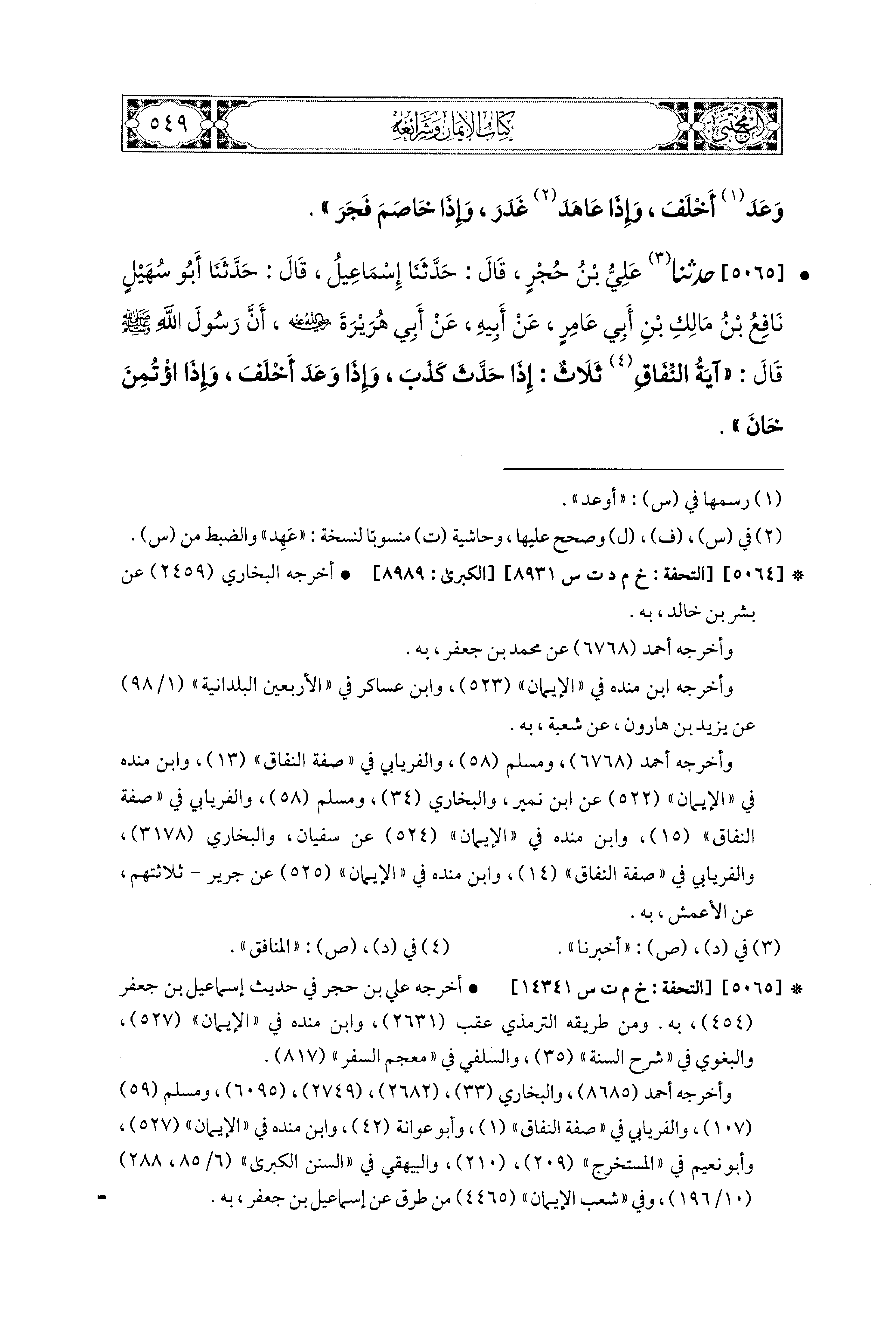 5065- حَدَّثَنَا عَلِيُّ بْنُ حُجْرٍ، قال: حَدثنا إِسماعِيلُ، قال: حَدثنا أَبو سُهَيْلٍ نَافِعُ بْنُ مَالِكِ بْنِ أَبِي عَامِرٍ، عَن أَبِيهِ، عَن أَبِي هُرَيرَةَ رضي الله عنه, أَنَّ رَسُولَ اللهِ صَلى الله عَليه وسَلم قَالَ: آيَةُ النِّفَاقِ ثَلاَثٌ: إِذَا حَدَّثَ كَذَبَ، وَإِذَا وَعَدَ أَخْلَفَ، وَإِذَا اؤْتُمِنَ خَانَ.