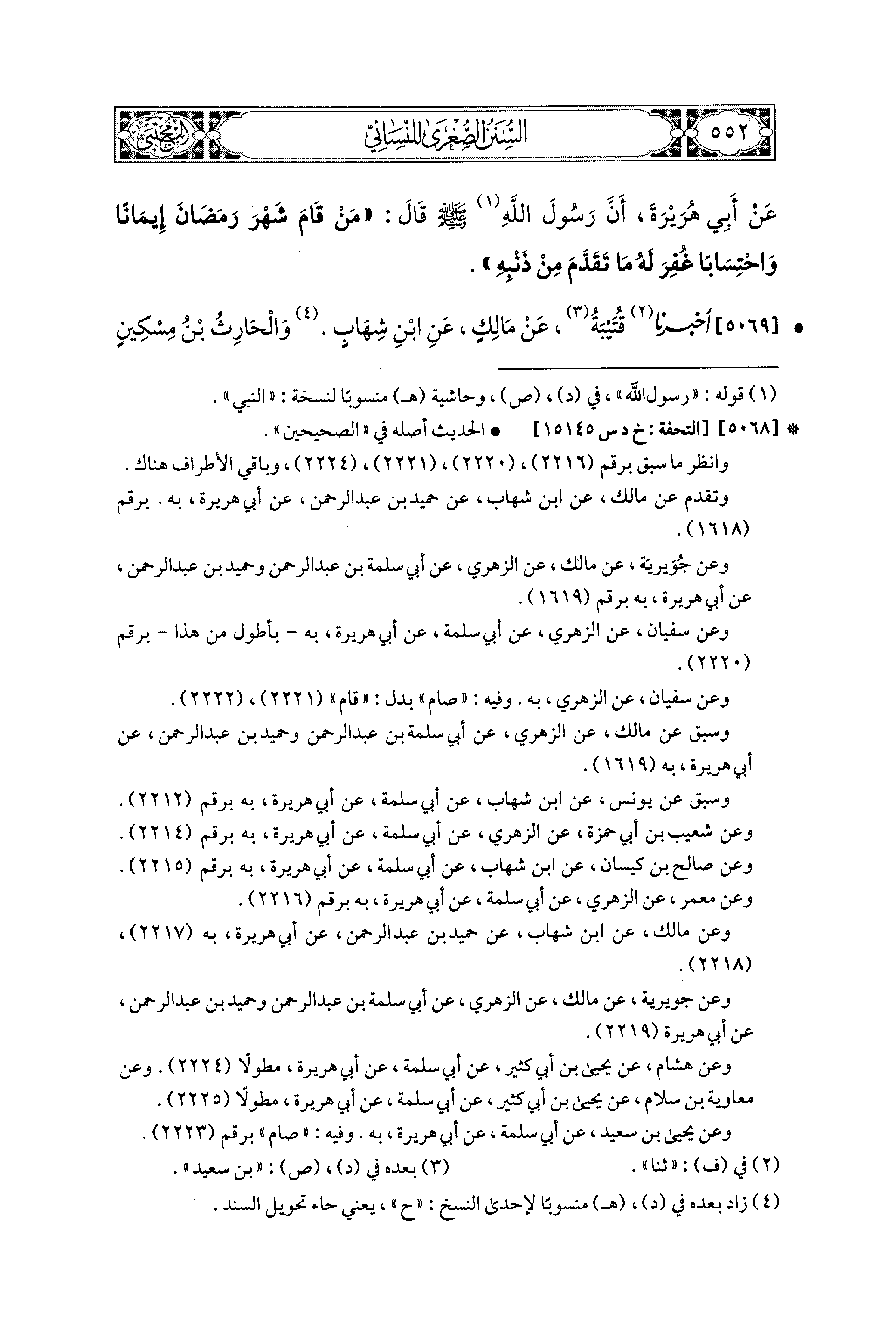 5069- أَخبَرَنا قُتَيبَةُ، عَن مَالِكٍ، عَنِ ابنِ شِهَابٍ (ح) وَالحَارِثُ بْنُ مِسْكِينٍ، قِرَاءَةً عَلَيْهِ وَأَنَا أَسْمَعُ، عَنِ ابنِ القَاسِمِ، قَالَ: حَدَّثَني مَالِكٌ، عَنِ ابنِ شِهَابٍ، عَن حُمَيْدِ بْنِ عَبدِ الرَّحمَنِ، عَن أَبِي هُرَيرَةَ، أَنَّ النَّبيَّ صَلى الله عَليه وسَلم قَالَ: مَنْ قَامَ رَمَضَانَ إِيمَانًا وَاحْتِسَابًا غُفِرَ لَهُ مَا تَقَدَّمَ مِنْ ذَنْبِهِ.