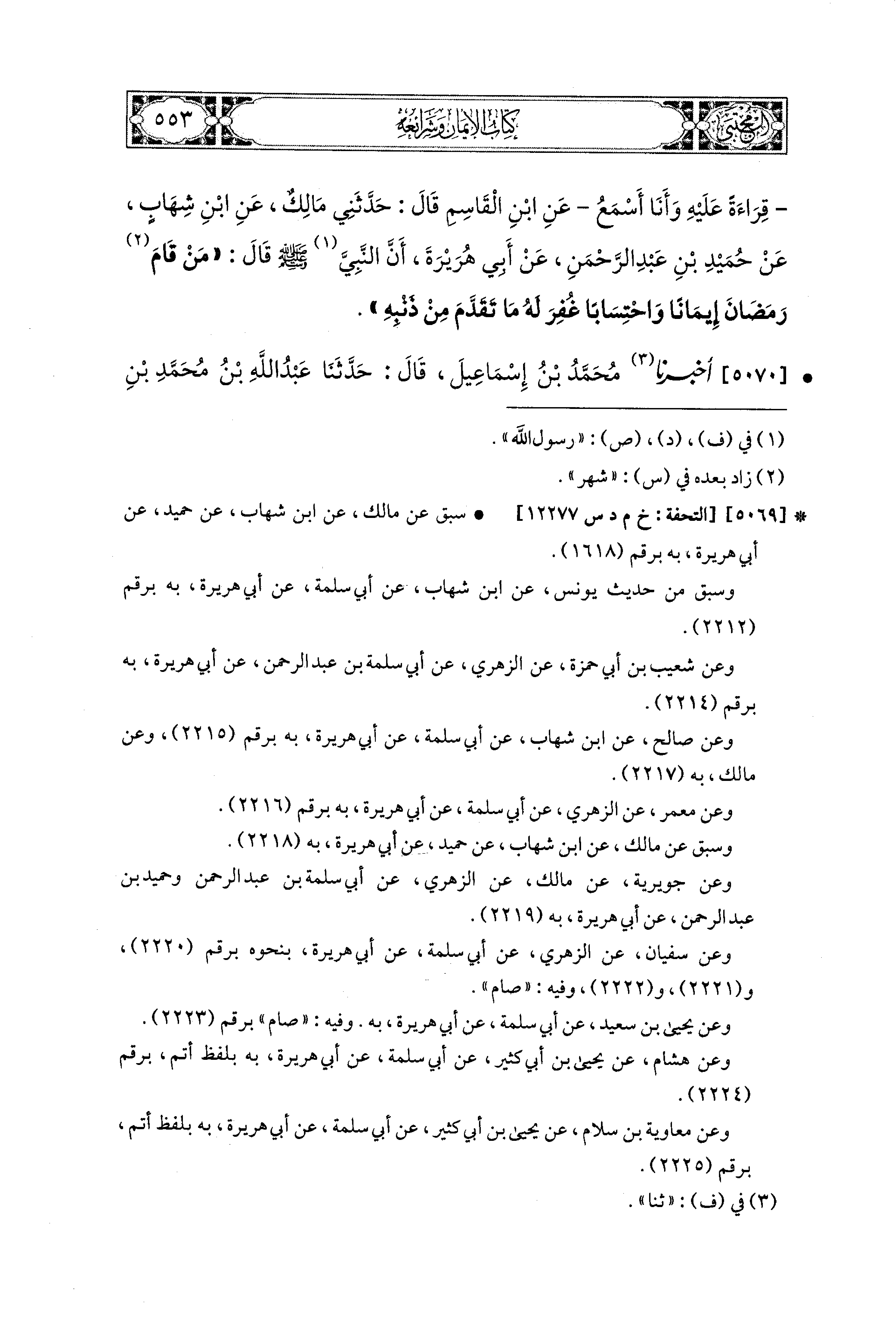 5070- أَخبَرَنا مُحَمد بْنُ إِسماعِيلَ، قال: حَدثنا عَبدُ اللهِ بْنُ مُحَمدِ بْنِ أَسْمَاءَ، قال: حَدثنا جُوَيْرِيَةُ، عَن مَالِكٍ، قال الزُّهْرِيِّ: أَخْبَرَني أَبو سَلَمَةَ بْنُ عَبدِ الرَّحمَنِ، وَحُمَيْدُ بْنُ عَبدِ الرَّحمَنِ، عَن أَبِي هُرَيرَةَ، أَنَّ النَّبيَّ صَلى الله عَليه وسَلم قَالَ: مَنْ قَامَ رَمَضَانَ إِيمَانًا وَاحْتِسَابًا غُفِرَ لَهُ مَا تَقَدَّمَ مِنْ ذَنْبِهِ.