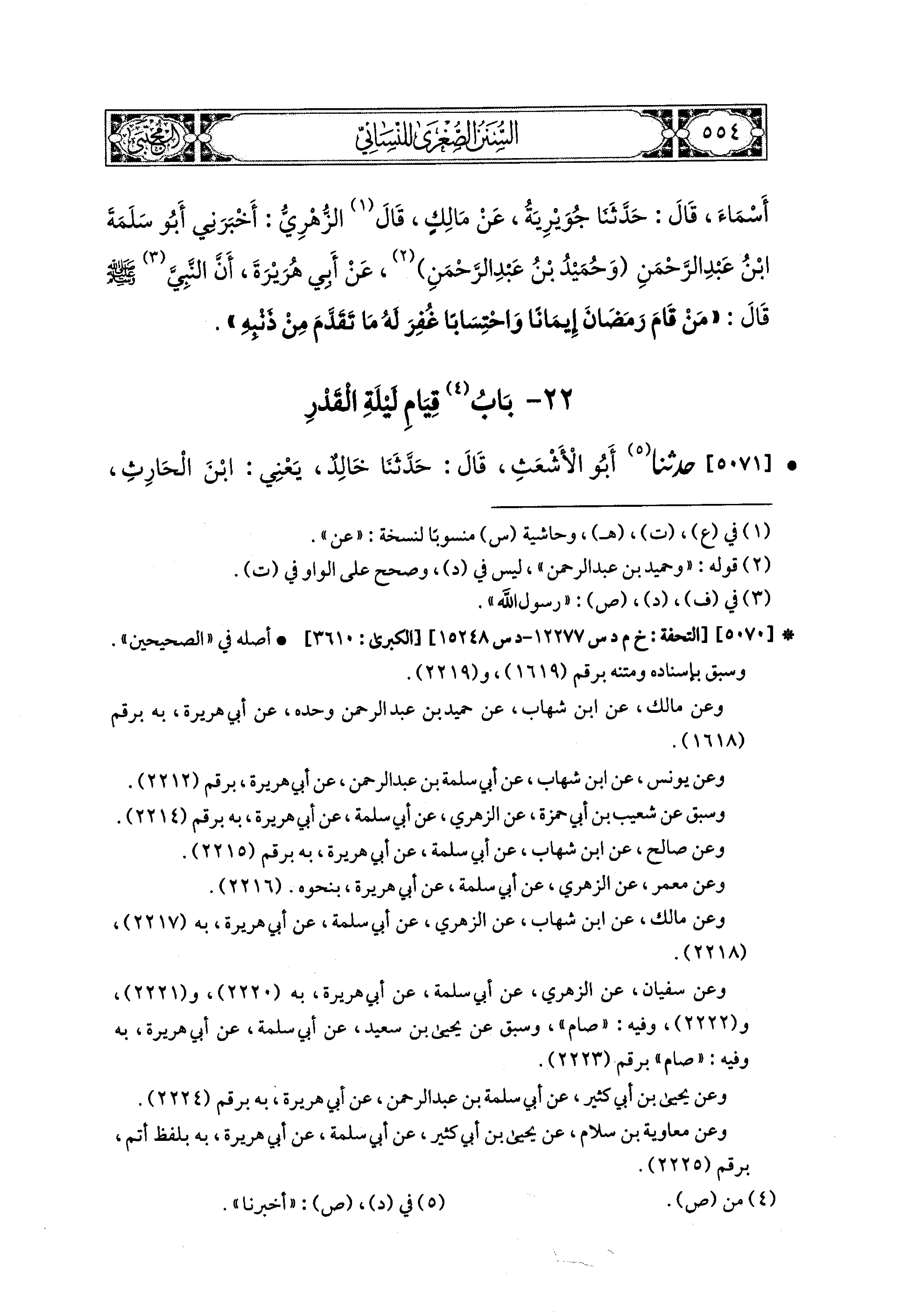 5071- حَدَّثَنَا أَبو الأَشْعَثِ، قال: حَدثنا خَالِدٌ، يَعْني ابْنَ الحَارِثِ، قال: حَدثنا هِشَامٌ، عَن يَحيَى بْنِ أَبِي كَثِيرٍ، عَن أَبِي سَلَمَةَ بْنِ عَبدِ الرَّحمَنِ، قَالَ: حَدَّثَني أَبو هُرَيرَةَ رضي الله عنه, أَنَّ رَسُولَ اللهِ صَلى الله عَليه وسَلم قَالَ: مَنْ قَامَ رَمَضَانَ إِيمَانًا وَاحْتِسَابًا غُفِرَ لَهُ مَا تَقَدَّمَ مِنْ ذَنْبِهِ، وَمَنْ قَامَ لَيْلَةَ القَدْرِ إِيمَانًا وَاحْتِسَابًا غُفِرَ لَهُ مَا تَقَدَّمَ مِنْ ذَنْبِهِ.