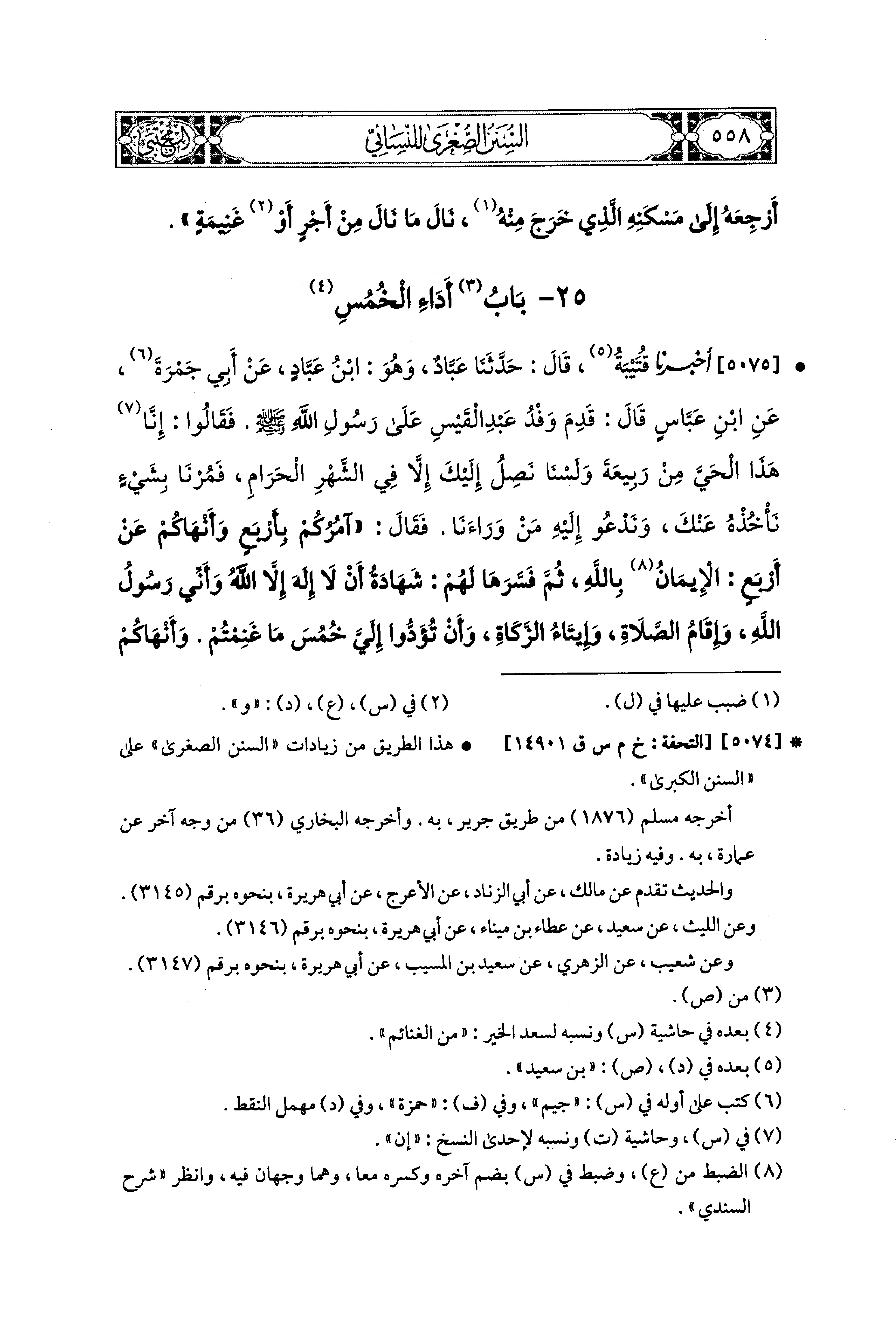 5075- أَخبَرَنا قُتَيبَةُ، قال: حَدثنا عَبَّادٌ، وَهُوَ ابْنُ عَبَّادٍ، عَن أَبِي جَمْرَةَ، عَنِ ابنِ عَبَّاسٍ، قَالَ: قَدِمَ وَفْدُ عَبدِ القَيْسِ عَلَى رَسُولِ اللهِ صَلى الله عَليه وسَلم فَقَالُوا: إِنَّا هَذَا الحَيَّ مِنْ رَبِيعَةَ، وَلَسْنَا نَصِلُ إِلَيْكَ إِلاَّ فِي الشَّهْرِ الحَرَامِ، فَمُرْنَا بِشَيْءٍ نَأْخُذُهُ عَنْكَ، وَنَدْعُو إِلَيْهِ مَنْ وَرَاءَنَا، فَقَالَ: آمُرُكُمْ بِأَرْبَعٍ وَأَنْهَاكُمْ عَن أَرْبَعٍ: الإِيمَانُ بِالله، ثُمَّ فَسَّرَهَا لَهُمْ، شَهَادَةُ أَنْ لاَ إِلَهَ إِلاَّ اللهُ، وَأَنِّي رَسُولُ اللهِ، وَإِقَامُ الصَّلاَةِ، وَإِيتَاءُ الزَّكَاةِ، وَأَنْ تُؤَدُّوا إِلَيَّ خُمُسَ مَا غَنِمْتُمْ، وَأَنْهَاكُمْ عَنِ الدُّبَّاءِ، وَالحَنْتَمِ، وَالمُقَيَّرِ، وَالمُزَفَّتِ.