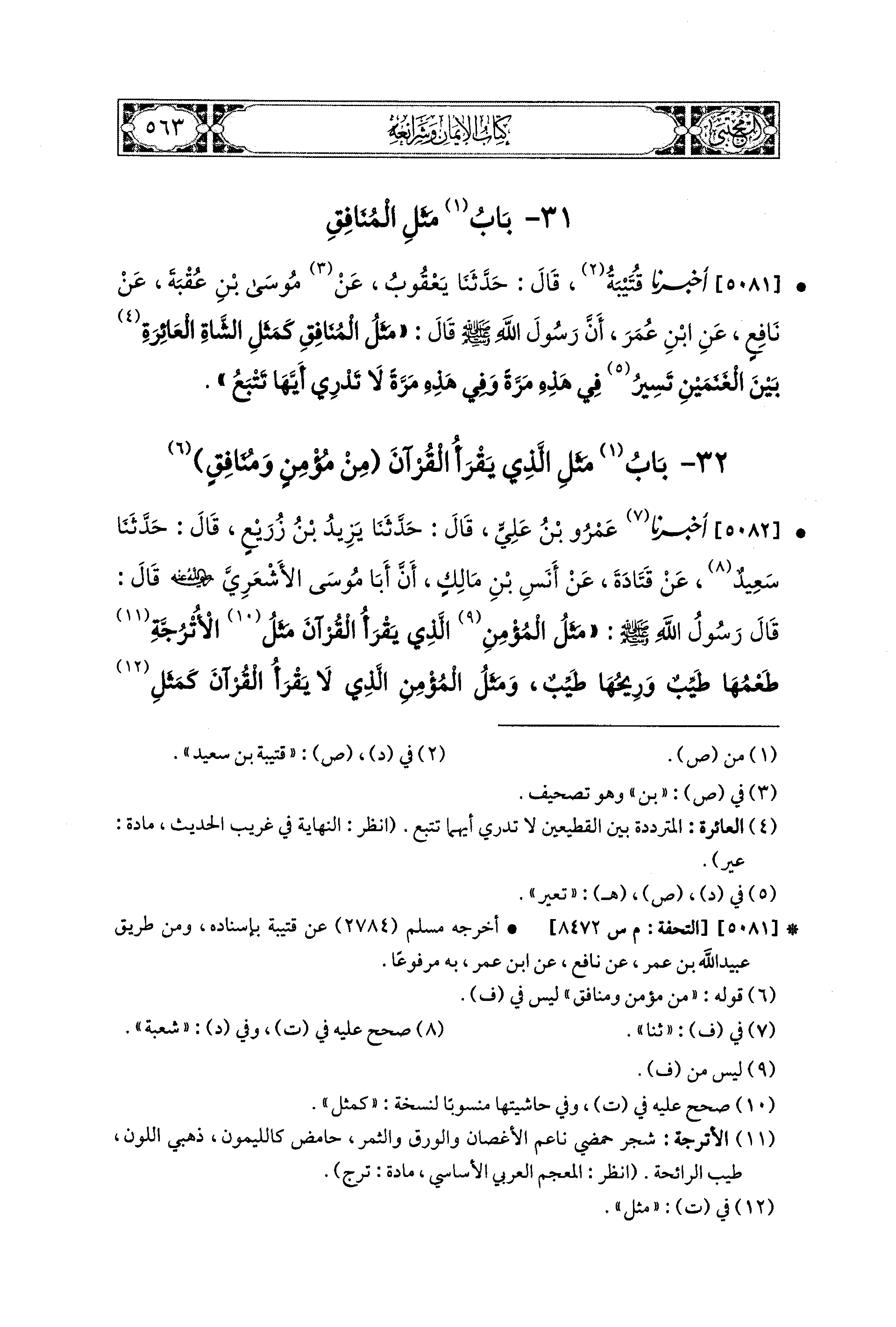 32- باب مَثَلُ الَّذِي يَقْرَأُ القُرْآنَ مِنْ مُؤْمِنٍ وَمُنَافِقٍ.