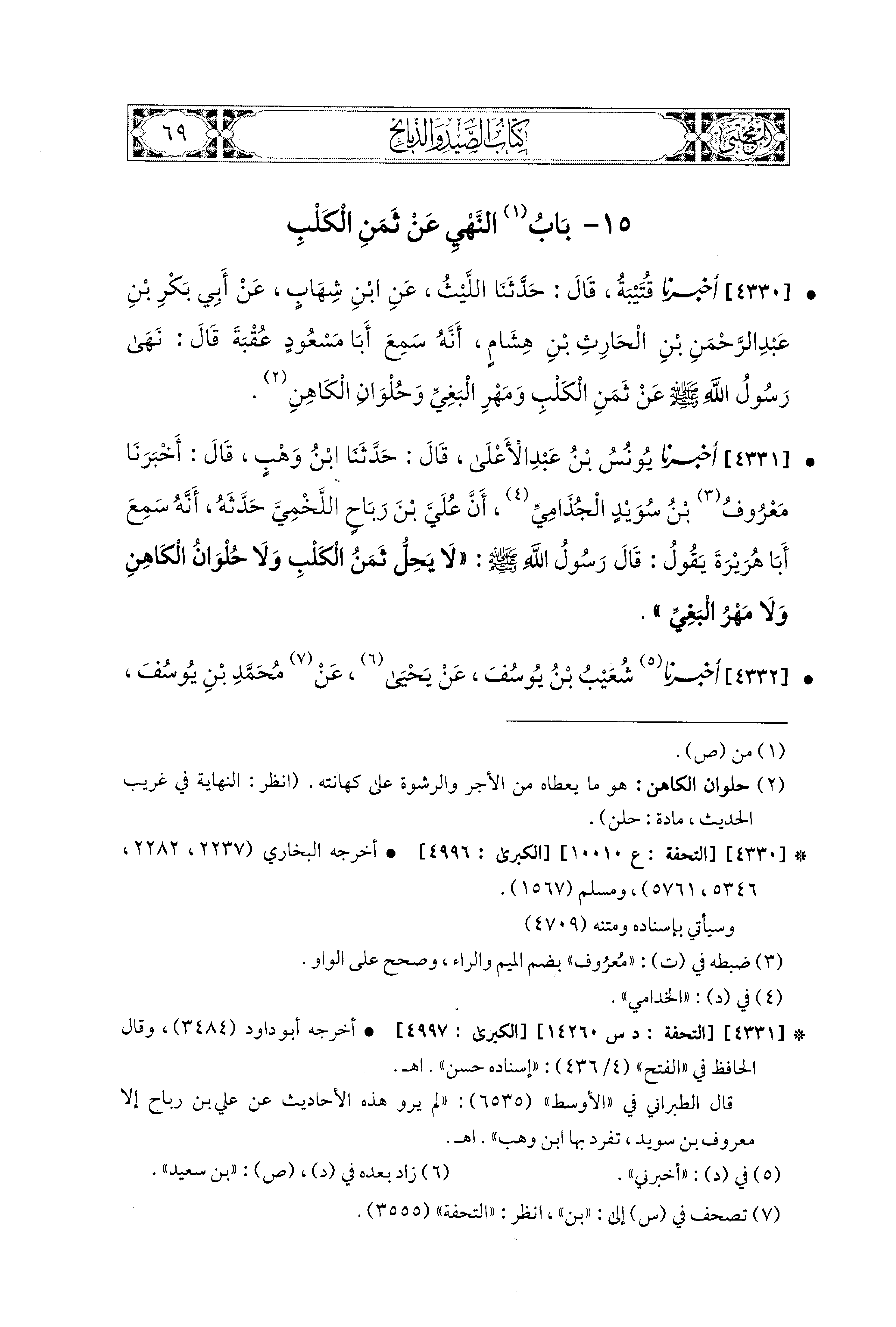 4330- أَخبَرَنا قُتَيبَةُ، قال: حَدثنا اللَّيْثُ، عَنِ ابنِ شِهَابٍ، عَن أَبِي بَكْرِ بْنِ عَبدِ الرَّحمَنِ بْنِ الحَارِثِ بْنِ هِشَامٍ، أَنَّهُ سَمِعَ أَبَا مَسْعُودٍ عُقْبَةَ قَالَ: نَهَى رَسُولُ اللهِ صَلى الله عَليه وسَلم عَن ثَمَنِ الكَلْبِ، وَمَهْرِ البَغِيِّ، وَحُلْوَانِ الكَاهِنِ.