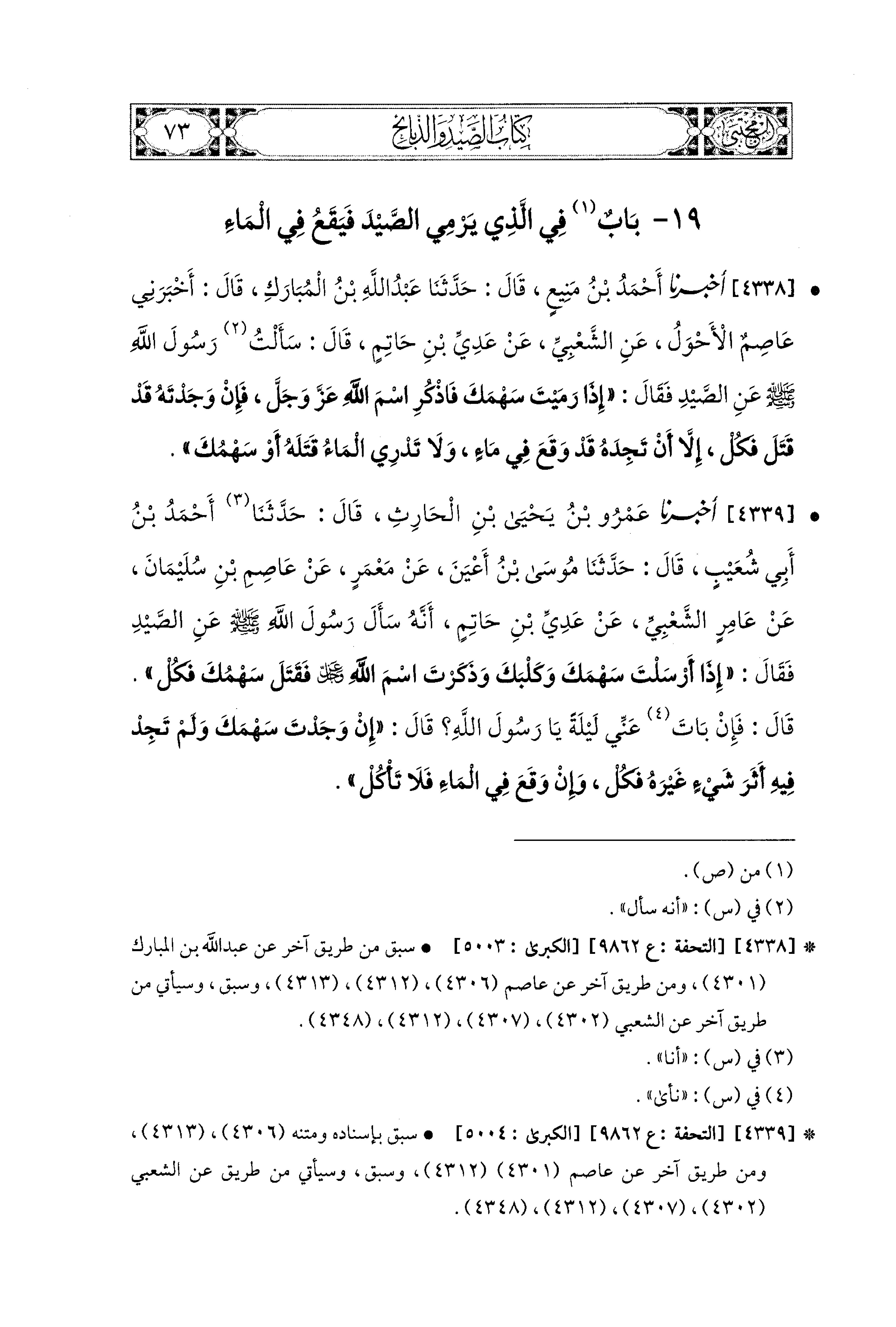 4338- أَخبَرَنا أَحْمَدُ بْنُ مَنيعٍ، قال: حَدثنا عَبدُ اللهِ بْنُ المُبَارَكِ، قَالَ: أَخْبَرَني عَاصِمٌ الأَحْوَلُ، عَنِ الشَّعْبِيِّ، عَن عَدِيِّ بْنِ حَاتِمٍ، قَالَ: سَأَلْتُ رَسُولَ اللهِ صَلى الله عَليه وسَلم عَنِ الصَّيْدِ، فَقَالَ: إِذَا رَمَيْتَ سَهْمَكَ فَاذْكُرِ اسْمَ اللهِ عَزَّ وَجَلَّ، فَإِنْ وَجَدْتَهُ قَدْ قُتِلَ فَكُلْ، إِلاَّ أَنْ تَجِدَهُ قَدْ وَقَعَ فِي مَاءٍ، وَلاَ تَدْرِي المَاءُ قَتَلَهُ، أَوْ سَهْمُكَ.