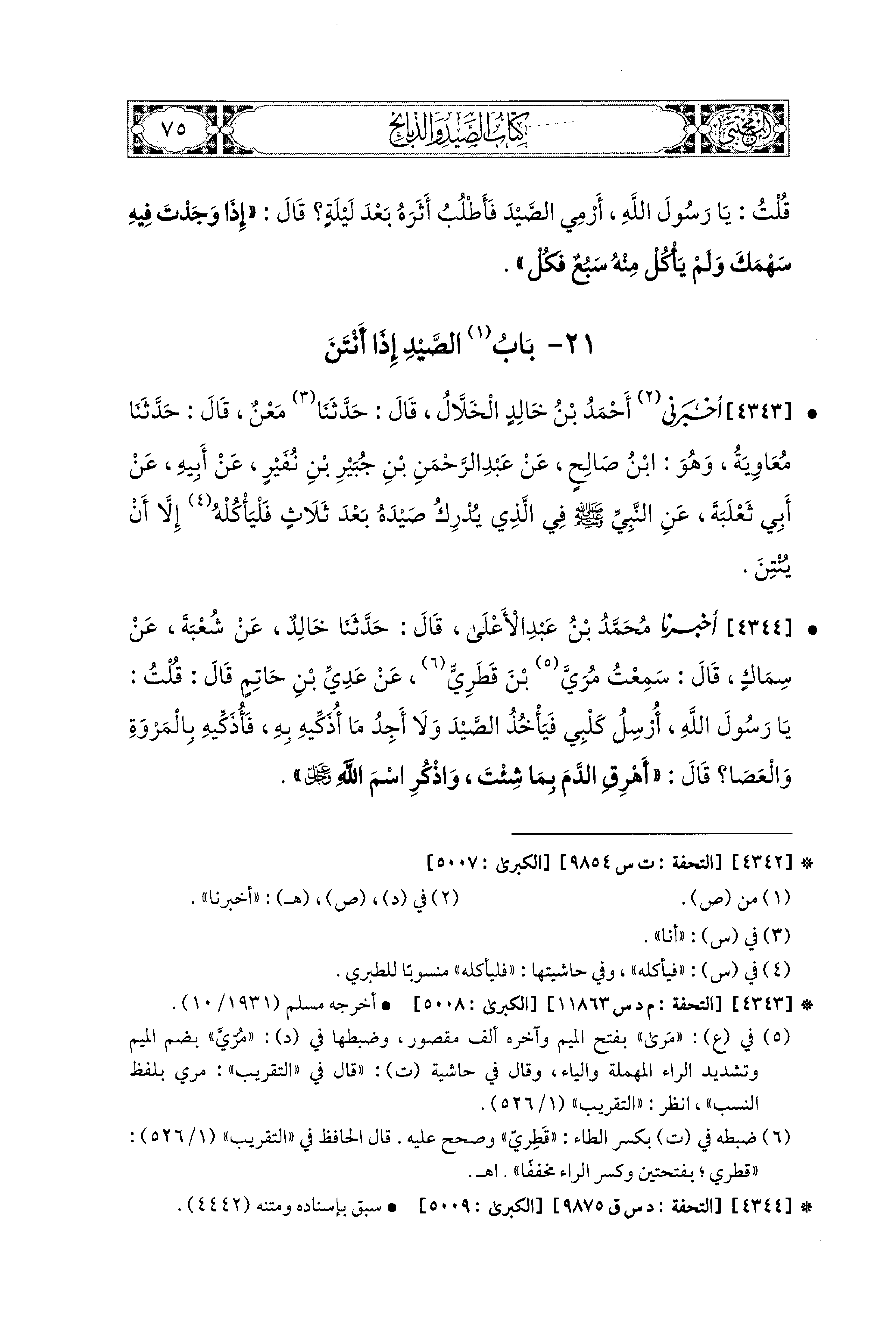 4343- أَخْبَرَني أَحْمَدُ بْنُ خَالِدٍ الخَلاَّلُ، قال: حَدثنا مَعْنٌ، قَالَ: حَدثنا مُعَاوِيَةُ، وَهُوَ ابْنُ صَالِحٍ، عَن عَبدِ الرَّحمَنِ بْنِ جُبَيْرِ بْنِ نُفَيْرٍ، عَن أَبِيهِ، عَن أَبِي ثَعْلَبَةَ، عَنِ النَّبيِّ صَلى الله عَليه وسَلم فِي الَّذِي يُدْرِكُ صَيْدَهُ بَعْدَ ثَلاَثٍ فَلْيَأْكُلْهُ إِلاَّ أَنْ يُنْتِنَ.