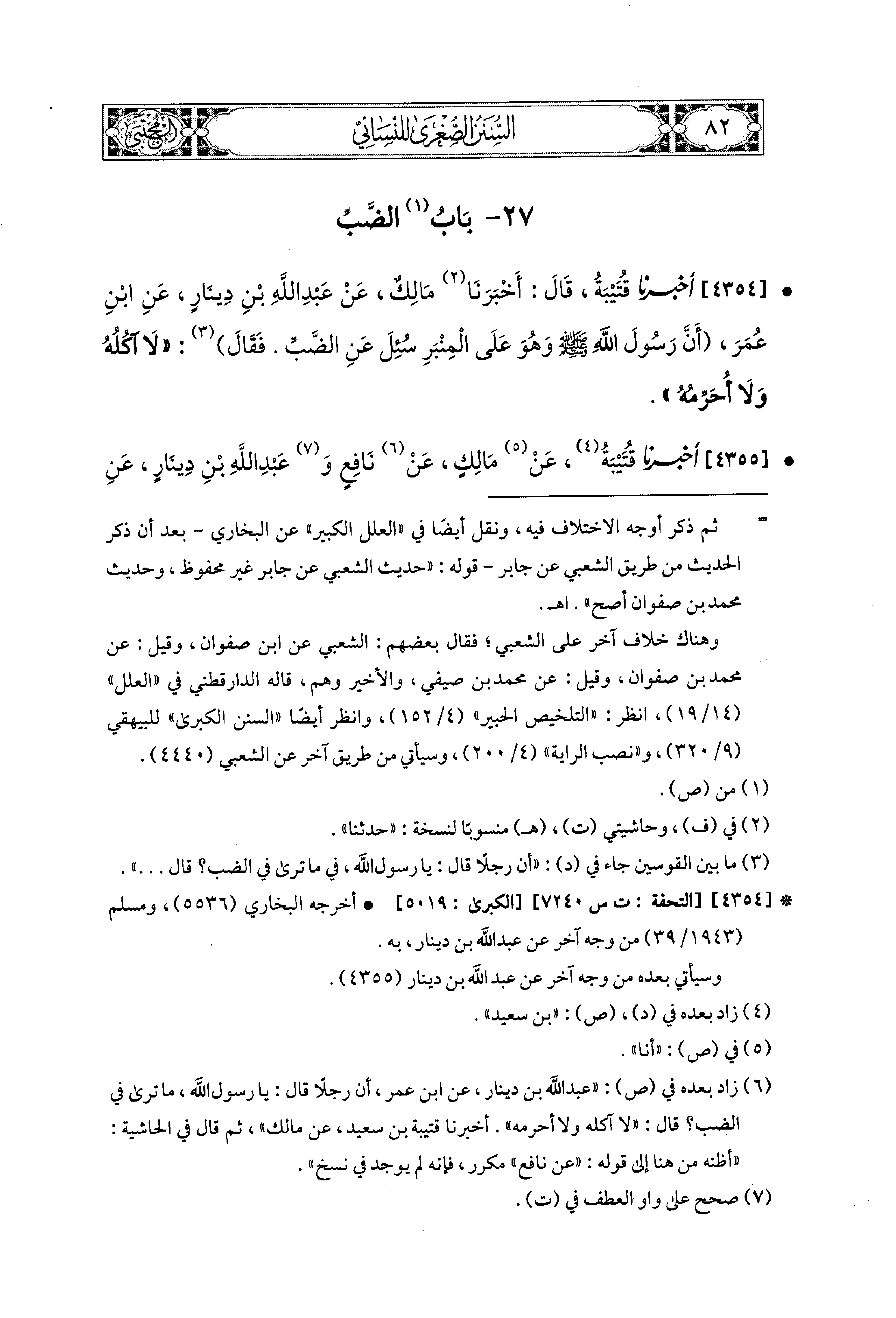 4355- أَخبَرَنا قُتَيبَةُ، عَن مَالِكٍ، عَن نَافِعٍ، وَعَبدِ اللهِ بْنِ دِينَارٍ، عَنِ ابنِ عُمَرَ، أَنَّ رَجُلاً قَالَ: يَا رَسُولَ اللهِ، مَا تَرَى فِي الضَّبِّ؟ قَالَ: لَسْتُ بِآكِلِهِ وَلاَ مُحَرِّمِهِ.