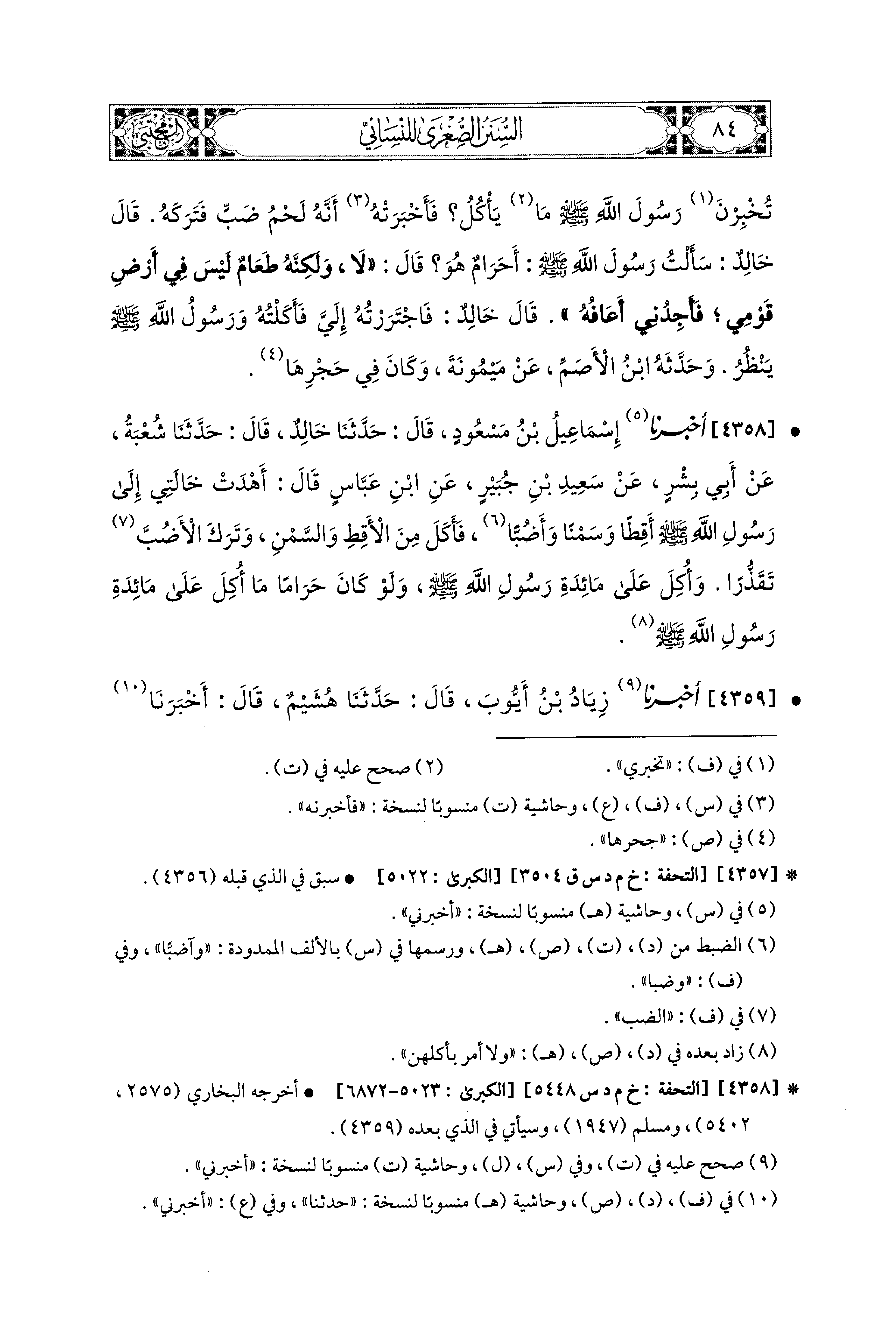 4358- أَخبَرَنا إِسماعِيلُ بْنُ مَسْعُودٍ، قال: حَدثنا خَالِدٌ، قال: حَدثنا شُعْبَةُ، عَن أَبِي بِشْرٍ، عَن سَعيدِ بْنِ جُبَيْرٍ، عَنِ ابنِ عَبَّاسٍ، قَالَ: أَهْدَتْ خَالَتِي إِلَى رَسُولِ اللهِ صَلى الله عَليه وسَلم أَقِطًا وَسَمْنًا وَأَضُبًّا، فَأَكَلَ مِنَ الأَقِطِ وَالسَّمْنِ، وَتَرَكَ الأَضُبَّ تَقَذُّرًا، وَأُكِلَ عَلَى مَائِدَةِ رَسُولِ اللهِ صَلى الله عَليه وسَلم، وَلَوْ كَانَ حَرَامًا مَا أُكِلَ عَلَى مَائِدَةِ رَسُولِ اللهِ صَلى الله عَليه وسَلم.