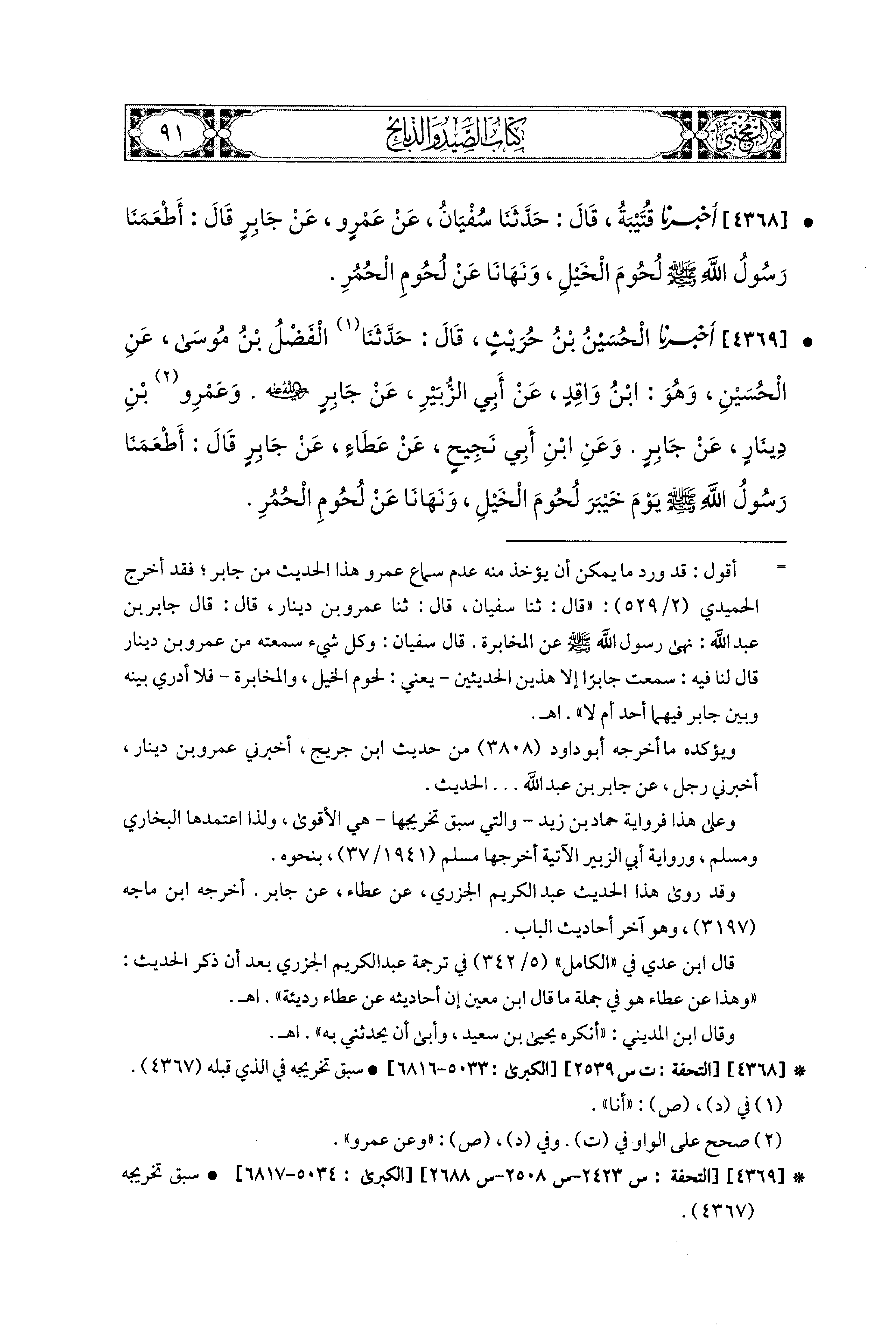4368- أَخبَرَنا قُتَيبَةُ، قال: حَدثنا سُفْيَانُ، عَن عَمْرٍو، عَن جَابِرٍ قَالَ: أَطْعَمَنَا رَسُولُ اللهِ صَلى الله عَليه وسَلم لُحُومَ الخَيْلِ، وَنَهَانَا عَن لُحُومِ الحُمُرِ.