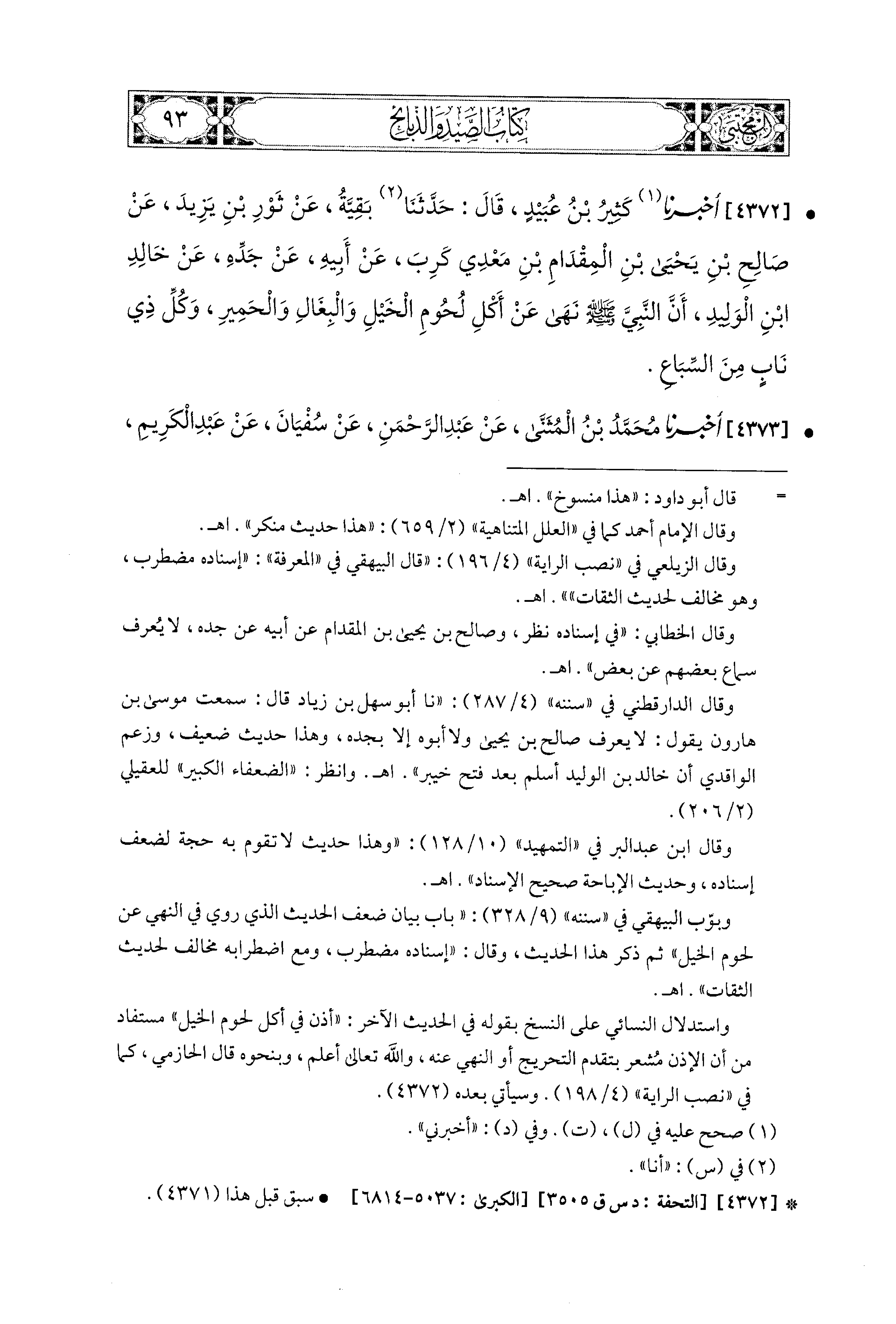 4372- أَخبَرَنا كَثِيرُ بْنُ عُبَيدٍ، قال: حَدثنا بَقِيَّةُ، عَن ثَوْرِ بْنِ يَزِيدَ، عَن صَالِحِ بْنِ يَحيَى بْنِ المِقْدَامِ بْنِ مَعْدِي كَرِبَ، عَن أَبِيهِ، عَن جَدِّهِ، عَن خَالِدِ بْنِ الوَلِيدِ، أَنَّ النبي صَلى الله عَليه وسَلم نَهَى عَن أَكْلِ لُحُومِ الخَيْلِ، وَالبِغَالِ، وَالحَميرِ، وَكُلِّ ذِي نَابٍ مِنَ السِّبَاعِ.