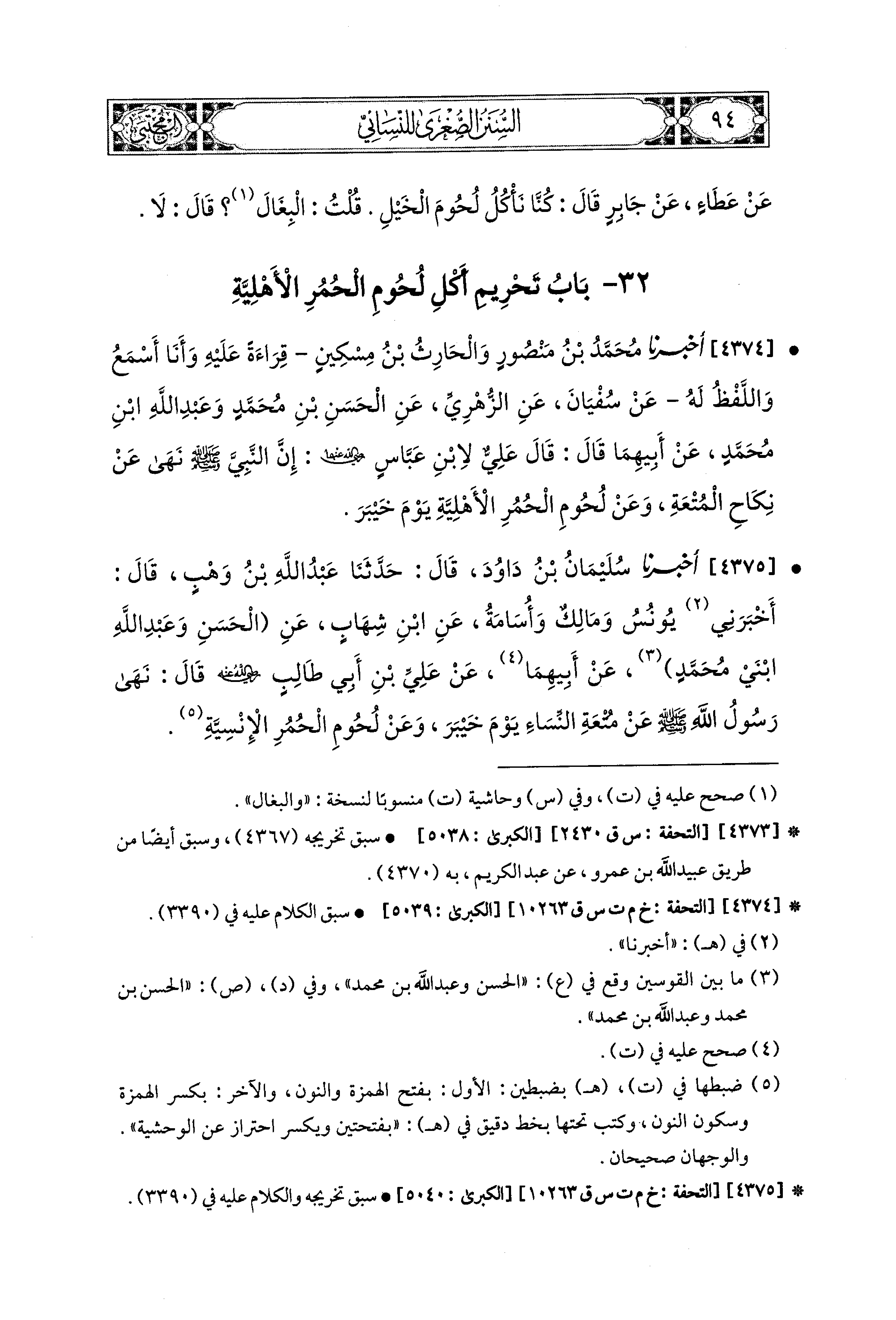 4375- أَخبَرَنا سُلَيمَانُ بْنُ دَاوُدَ، قال: حَدثنا عَبدُ اللهِ بْنُ وَهْبٍ، قَالَ: أَخْبَرَني يُونُسُ، وَمَالِكٌ، وَأُسَامَةُ، عَنِ ابنِ شِهَابٍ، عَنِ الحَسَنِ، وَعَبدِ اللهِ، ابْنَيْ مُحَمدٍ، عَن أَبِيهِمَا، عَن عَلِيِّ بْنِ أَبِي طَالِبٍ، رَضِيَ اللهُ عَنْهُ، قَالَ: نَهَى رَسُولُ اللهِ صَلى الله عَليه وسَلم عَن مُتْعَةِ النِّسَاءِ يَوْمَ خَيْبَرَ، وَعَنْ لُحُومِ الحُمُرِ الإِنْسِيَّةِ.