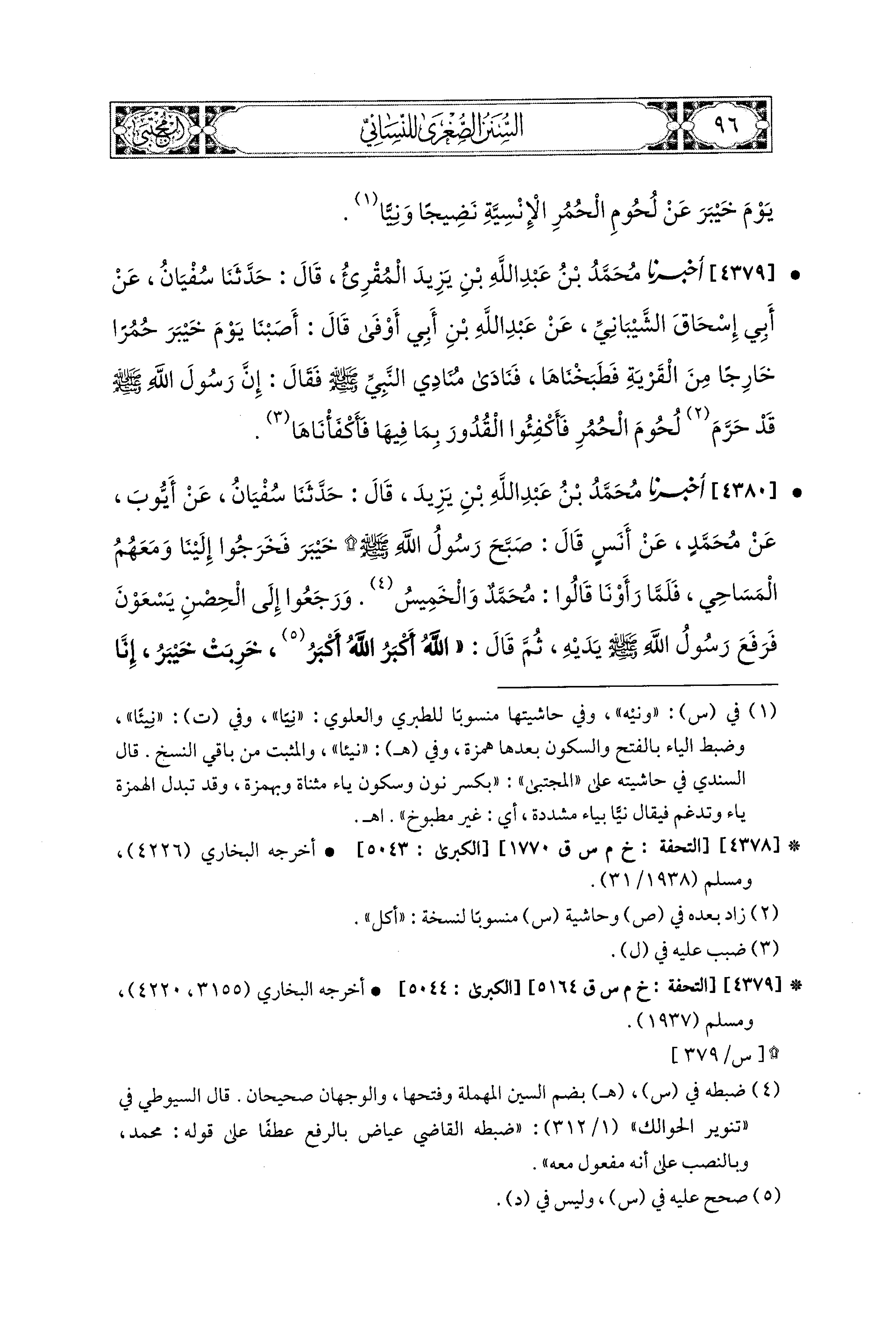 4380- أَخبَرَنا مُحَمد بْنُ عَبدِ اللهِ بْنِ يَزِيدَ، قال: حَدثنا سُفْيَانُ، عَن أَيُّوبَ، عَن مُحَمدٍ، عَن أَنَسٍ، قَالَ: صَبَّحَ رَسُولُ اللهِ صَلى الله عَليه وسَلم خَيْبَرَ، فَخَرَجُوا إِلَيْنَا، وَمَعَهُمُ المَسَاحِي، فَلَمَّا رَأَوْنَا، قَالُوا: مُحَمدٌ وَالخَميسُ، وَرَجَعُوا إِلَى الحِصْنِ يَسْعَوْنَ، فَرَفَعَ رَسُولُ اللهِ صَلى الله عَليه وسَلم يَدَيْهِ، ثُمَّ قَالَ: اللهُ أَكْبَرُ اللهُ أَكْبَرُ، خَرِبَتْ خَيْبَرُ، إِنَّا إِذَا نَزَلْنَا بِسَاحَةِ قَوْمٍ فَسَاءَ صَبَاحُ المُنْذَرِينَ، فَأَصَبْنَا فِيهَا حُمُرًا، فَطَبَخْنَاهَا، فَنَادَى مُنَادِي النَّبيِّ صَلى الله عَليه وسَلم فَقَالَ: إِنَّ اللهَ عَزَّ وَجَلَّ وَرَسُولَهُ يَنْهَاكُمْ عَن لُحُومِ الحُمُرِ، فَإِنَّهَا رِجْسٌ.