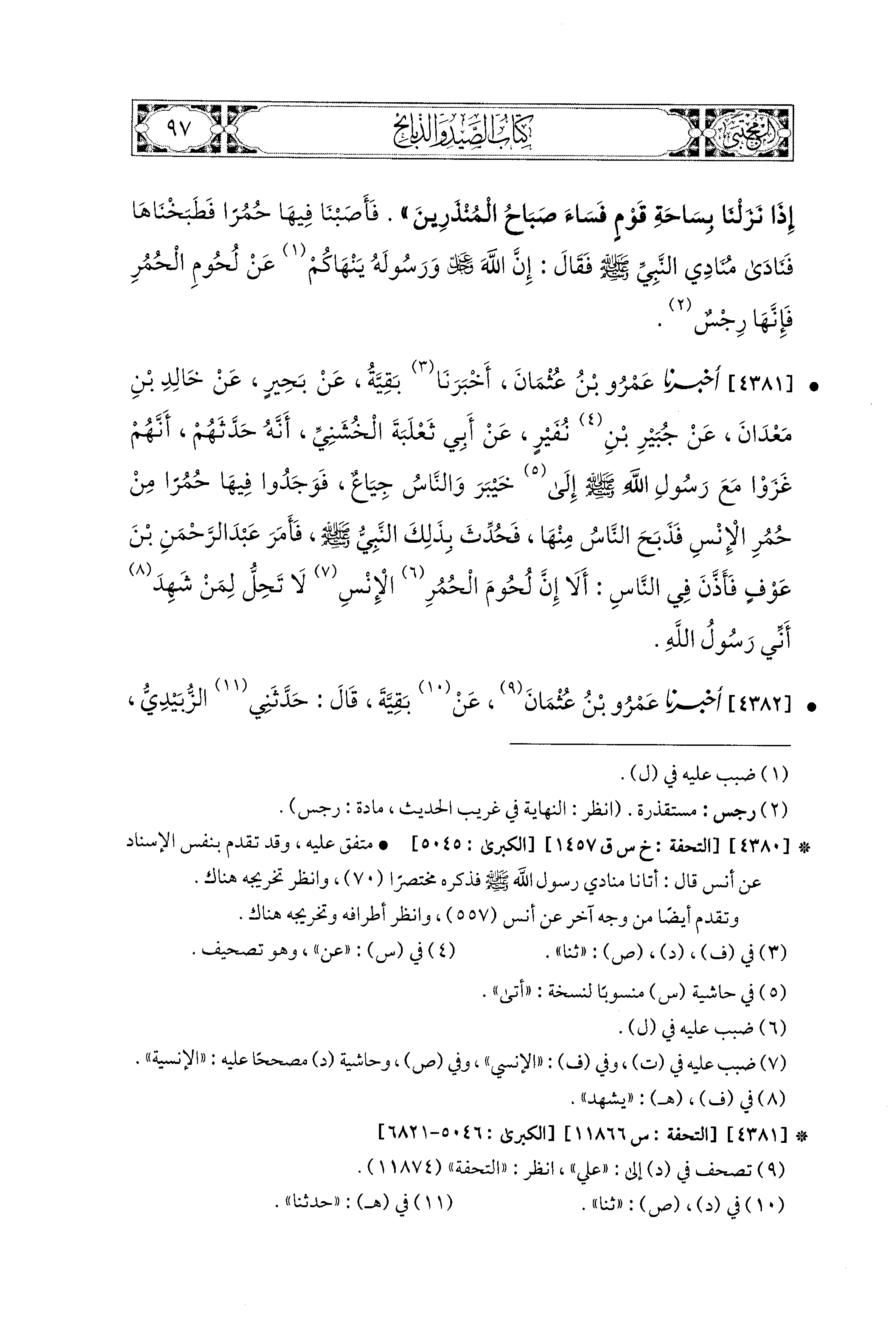 4381- أَخبَرَنا عَمْرُو بْنُ عُثمَانَ، أَخبَرنا بَقِيَّةُ، عَن بَحِيرٍ، عَن خَالِدِ بْنِ مَعْدَانَ، عَن جُبَيْرِ بْنِ نُفَيْرٍ، عَن أَبِي ثَعْلَبَةَ الخُشَنيِّ، أَنَّهُ حَدَّثَهُمْ أَنَّهُمْ غَزَوْا مَعَ رَسُولِ اللهِ صَلى الله عَليه وسَلم إِلَى خَيْبَرَ، وَالنَّاسُ جِيَاعٌ، فَوَجَدُوا فِيهَا حُمُرًا مِنْ حُمُرِ الإِنْسِ، فَذَبَحَ النَّاسُ مِنْهَا، فَحُدِّثَ بِذَلِكَ النَّبيُّ صَلى الله عَليه وسَلم، فَأَمَرَ عَبدَ الرَّحمَنِ بْنَ عَوْفٍ، فَأَذَّنَ فِي النَّاسِ: أَلاَ إِنَّ لُحُومَ الحُمُرِ الإِنْسِ لاَ تَحِلُّ لِمَنْ شَهِدَ أَنِّي رَسُولُ الله.