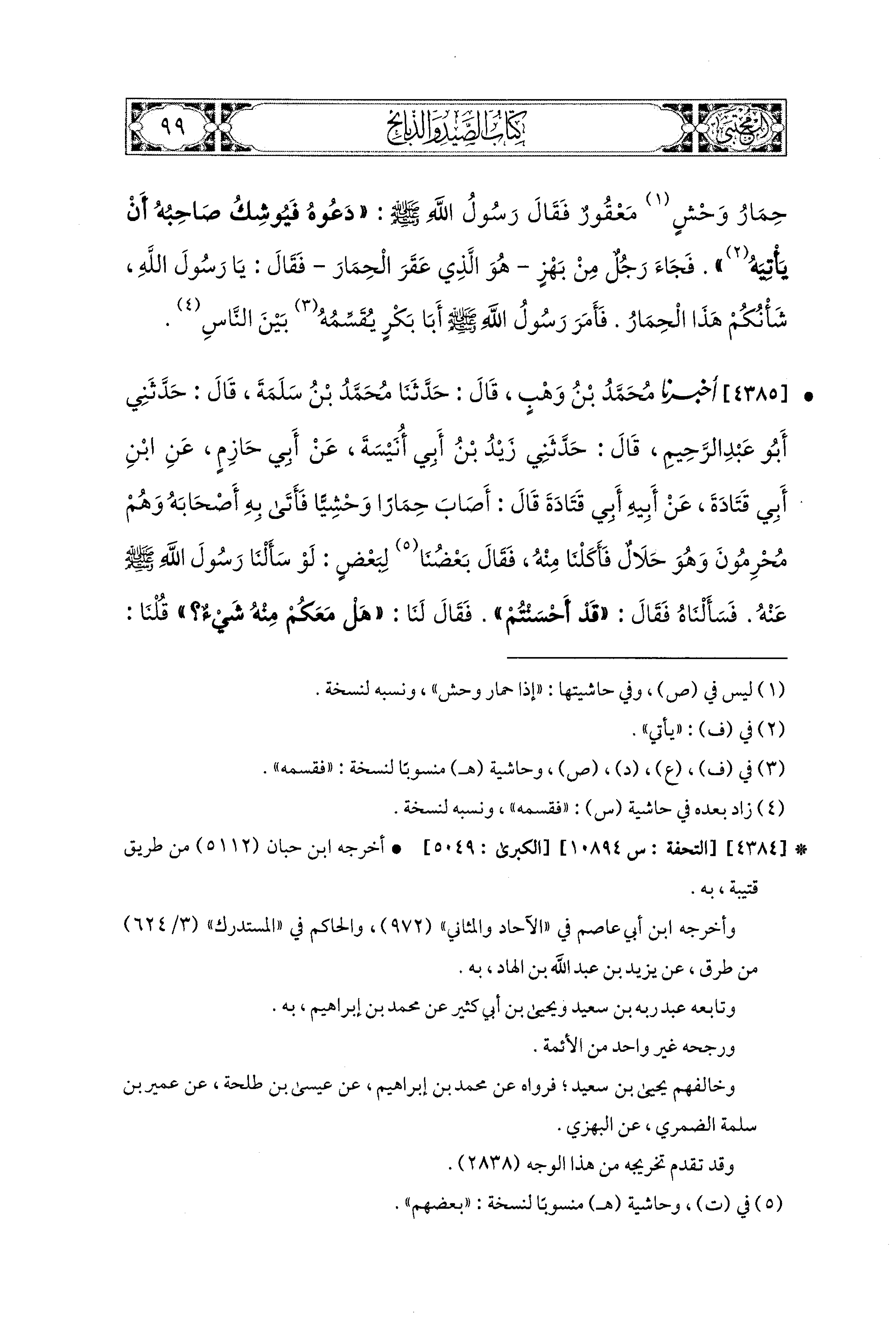 4385- أَخبَرَنا مُحَمد بْنُ وَهْبٍ، قال: حَدثنا مُحَمدُ بْنُ سَلَمَةَ، قَالَ: حَدَّثَني أَبو عَبدِ الرَّحِيمِ، قَالَ: حَدَّثَني زَيْدُ بْنُ أَبِي أُنَيْسَةَ، عَن أَبِي حَازِمٍ، عَنِ ابنِ أَبِي قَتَادَةَ، عَن أَبِيهِ أَبِي قَتَادَةَ، قَالَ: أَصَابَ حِمَارًا وَحْشِيًّا، فَأَتَى بِهِ أَصْحَابَهُ وَهُمْ مُحْرِمُونَ، وَهُوَ حَلاَلٌ، فَأَكَلْنَا مِنْهُ، فَقَالَ بَعْضُنَا لِبَعْضٍ: لَوْ سَأَلْنَا رَسُولَ اللهِ صَلى الله عَليه وسَلم عَنْهُ، فَسَأَلْنَاهُ، فَقَالَ: قَدْ أَحْسَنْتُمْ، فَقَالَ لَنَا: هَلْ مَعَكُمْ مِنْهُ شَيْءٌ؟ قُلْنَا: نَعَمْ، قَالَ: فَاهْدُوا لَنَا، قال: فَأَتَيْنَاهُ مِنْهُ فَأَكَلَ مِنْهُ وَهُوَ مُحْرِمٌ.