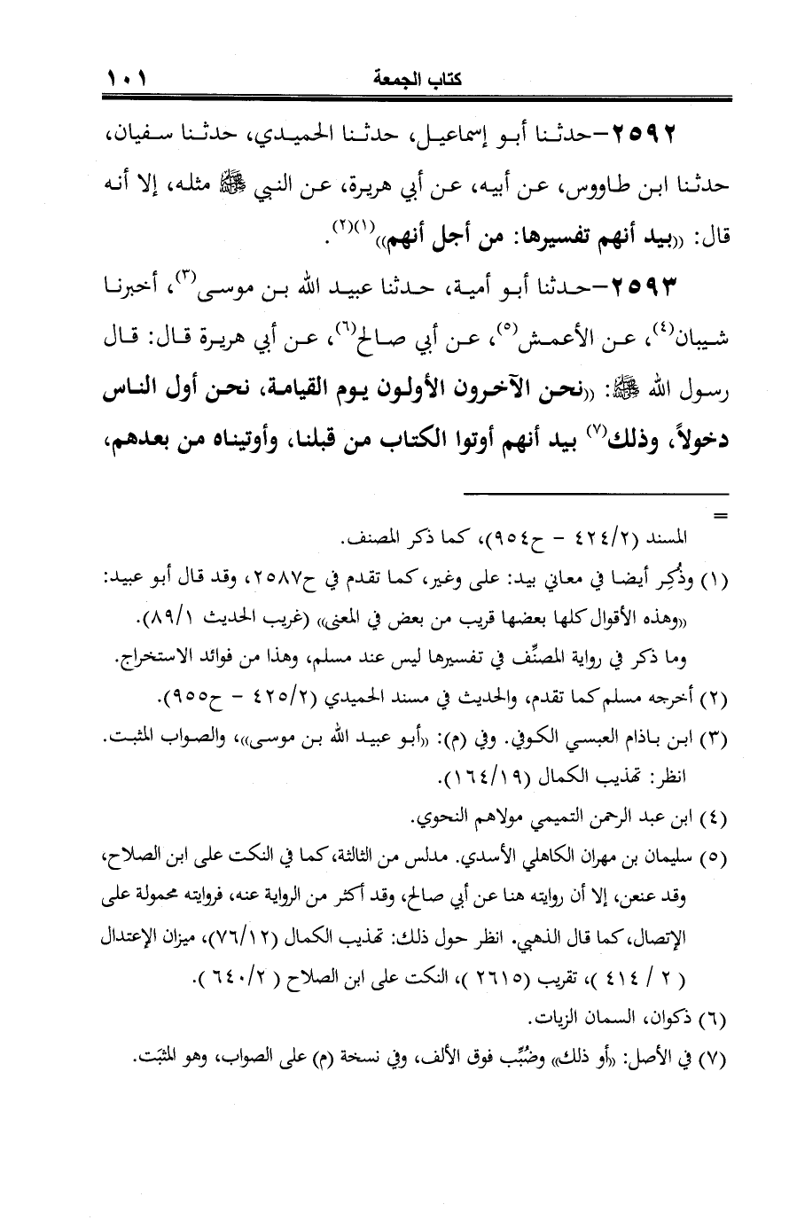2593 - حدثنا أبو أمية، حدثنا عبيد الله بن موسى (¬1)، أخبرنا شيبان (¬2)، عن الأعمش (¬3)، عن أبي صالح (¬4)، عن أبي هريرة قال: قال رسول الله -صلى الله عليه وسلم-: "نحن الآخرون الأولون يوم القيامة، نحن أول الناس دخولًا، وذلك (¬5) بيد أنهم أوتوا الكتاب من قبلنا، وأوتيناه من بعدهم،