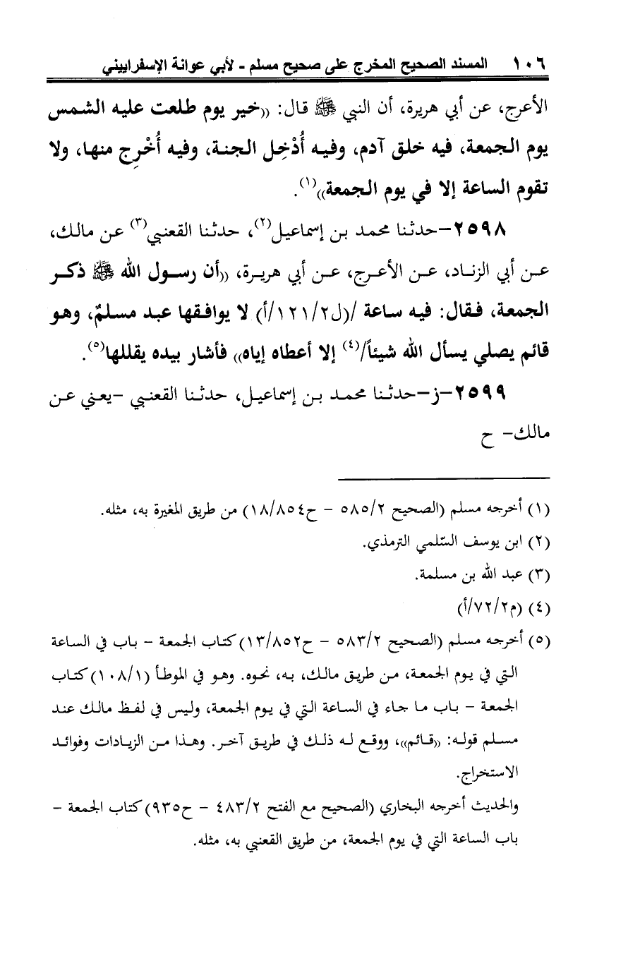(¬4) أخرجه مسلم (الصحيح 2/ 583 - ح 13/ 852) كتاب الجمعة -باب في الساعة التي في يوم الجمعة، من طريق مالك، به، نحوه. وهو في الموطأ (1/ 108) كتاب الجمعة -باب ما جاء في الساعة التي في يوم الجمعة، وليس في لفظ مالك عند مسلم قوله: "قائم"، ووقع له ذلك في طريق آخر. وهذا من الزيادات وفوائد الاستخراج.