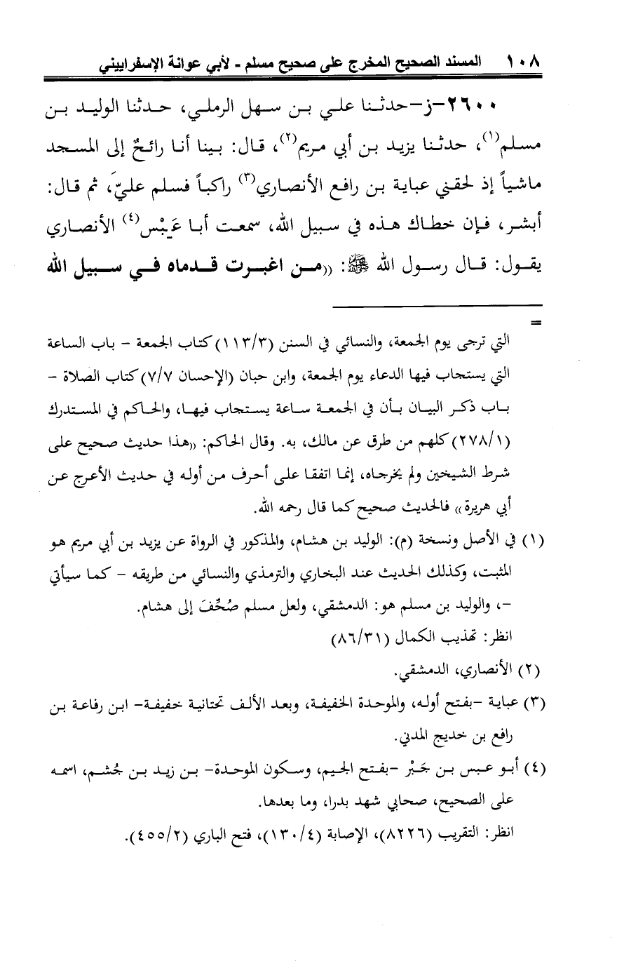 2600 - ز- حدثنا علي بن سهل الرملي، حدثنا الوليد بن مسلم (¬1)، حدثنا يزيد بن أبي مريم (¬2)، قال: بينا أنا رائحٌ إلى المسجد ماشيًا إذ لحقني عباية بن رافع الأنصاري (¬3) راكبًا فسلم عليَّ، ثم قال: أبشر، فإن خطاك هذه في سبيل الله، سمعت أبا عبس (¬4) الأنصاري يقول: قال رسول الله -صلى الله عليه وسلم-: "من اغبرت قدماه في سبيل الله