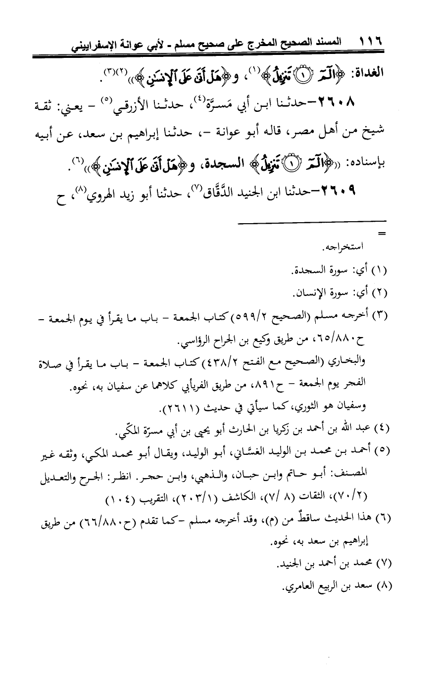 2608 - حدثنا ابن أبي مَسرَّة (¬1)، حدثنا الأزرقي (¬2) -يعني: ثقة شيخ من أهل مصر، قاله أبو عوانة-، حدثنا إبراهيم بن سعد، عن أبيه بإسناده: {الم (1) تَنْزِيلُ} السجدة، و {هَلْ أَتَى عَلَى الْإِنْسَانِ} " (¬3).