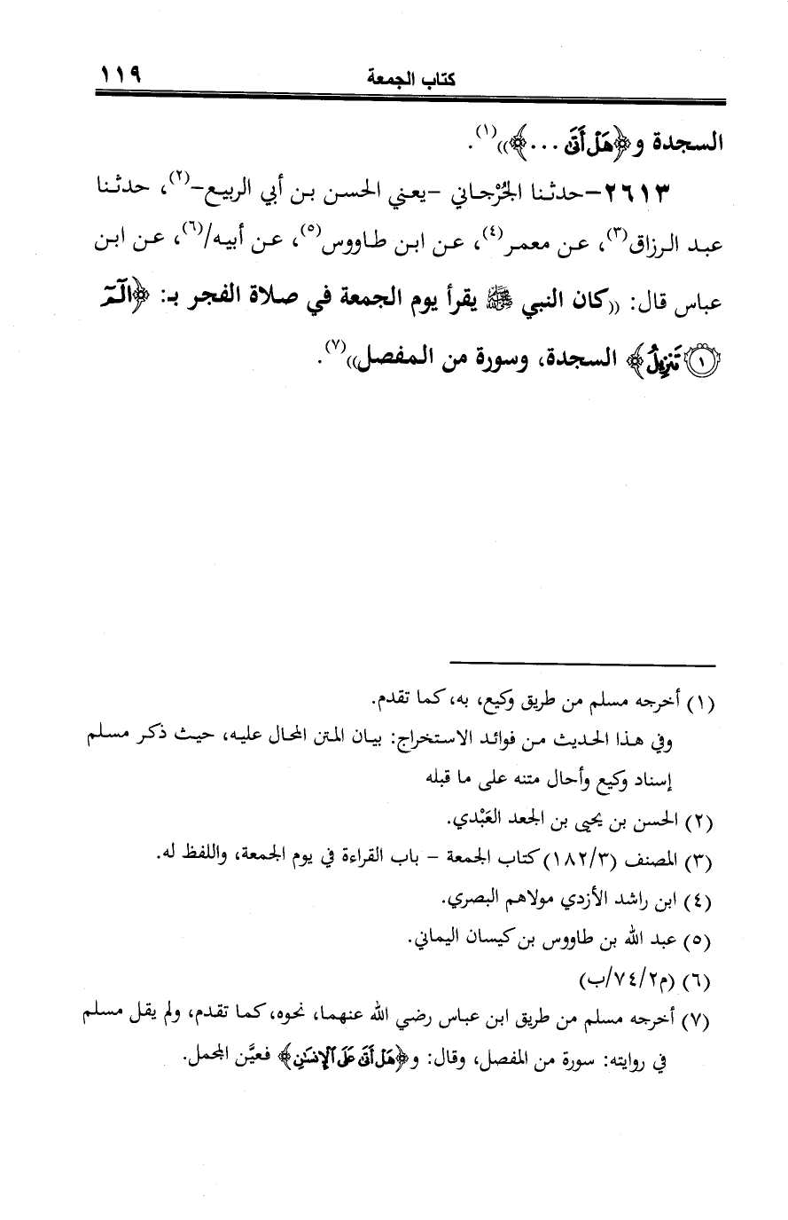 2613 - حدثنا الجُرْجاني -يعني الحسن بن أبي الربيع- (¬1)، حدثنا عبد الرزاق (¬2)، عن معمر (¬3)، عن ابن طاووس (¬4)، عن أبيه (¬5)، عن ابن عباس قال: "كان النبي -صلى الله عليه وسلم- يقرأ يوم الجمعة في صلاة الفجر بـ: {الم (1) تَنْزِيلُ} السجدة، وسورة من المفصل" (¬6).