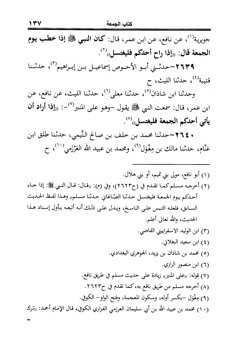 وحدثنا أبو أمية (¬5)، حدثنا يعلى بن عبيد (¬6)، ومحمد بن سابق (¬7) قالا: حدثنا مالك بن مغول، عن نافع، عن ابن عمر قال: قال النبي -صلى الله عليه وسلم-: "أيكم جاء إلى الجمعة فليغتسل".