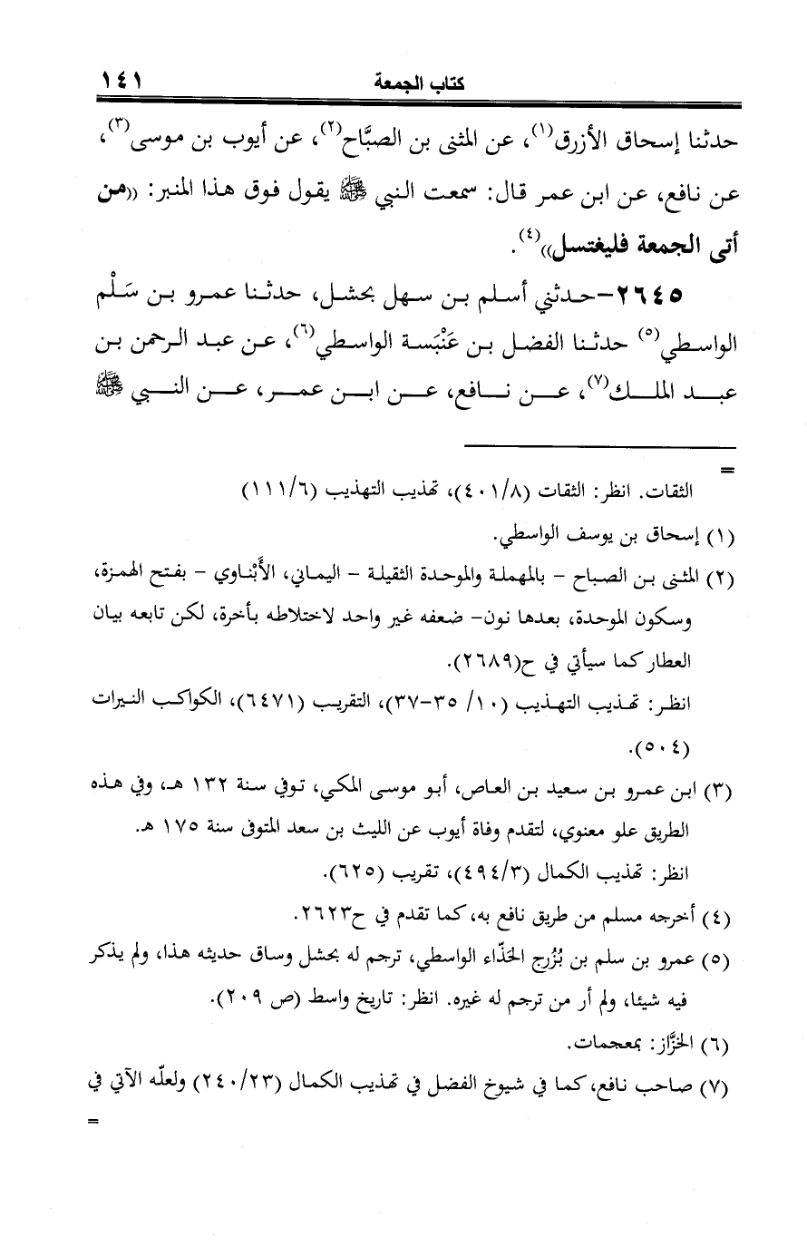 2645 - حدثني أسلم بن سهل بحشل، حدثنا عمرو بن سَلْم الواسطي (¬1) حدثنا الفضل بن عَنْبَسة الواسطي (¬2)، عن عبد الرحمن بن عبد الملك (¬3)، عن نافع، عن ابن عمر، عن النبي -صلى الله عليه وسلم-