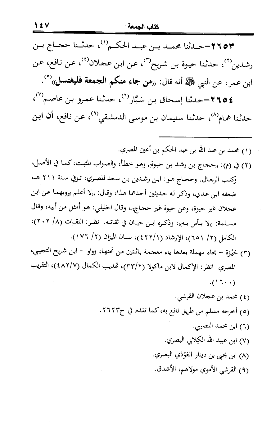 2653 - حدثنا محمد بن عبد الحكم (¬1)، حدثنا حجاج بن رشدين (¬2)، حدثنا حيوة بن شريح (¬3)، عن ابن عجلان (¬4)، عن نافع، عن ابن عمر، عن النبي -صلى الله عليه وسلم- أنه قال: "من جاء منكم الجمعة فليغتسل" (¬5).