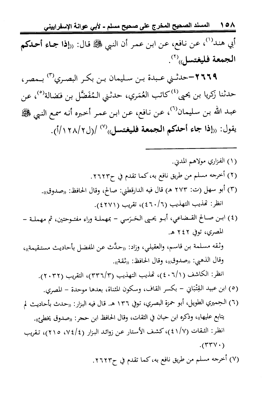 2669 - حدثني عبدة بن سليمان بن بكر البصري (¬1) بمصر، حدثنا زكريا بن يحيى (¬2) كاتب العُمَري، حدثني المُفَضَّل بن فَضالة (¬3)، عن عبد الله بن سليمان (¬4)، عن نافع، عن ابن عمر أخبره أنه سمع النبي -صلى الله عليه وسلم- يقول: "إذا جاء أحدكم الجمعة فليغتسل" (¬5).