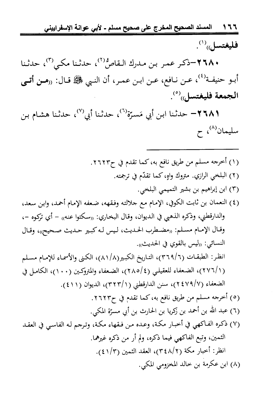 2680 - ذكر عمر بن مدرك القاصُّ (¬1)، حدثنا مكي (¬2)، حدثنا أَبو حنيفة (¬3)، عن نافع، عن ابن عمر، أن النبي -صلى الله عليه وسلم- قال: "من أتى الجمعة فليغتسل" (¬4).