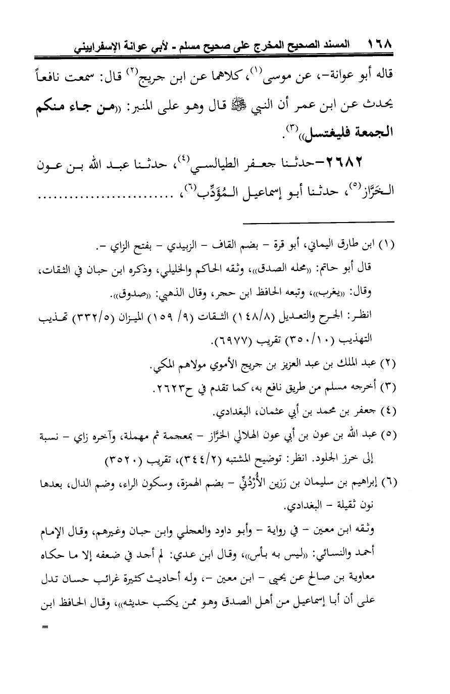 -[169]- عن مسعر (¬4)، عن رجل من بجيلة (¬5)، عن نافع، عن ابن عمر أنَّ النبي -صلى الله عليه وسلم- قال: "من أتى الجمعة فليغتسل" (¬6).