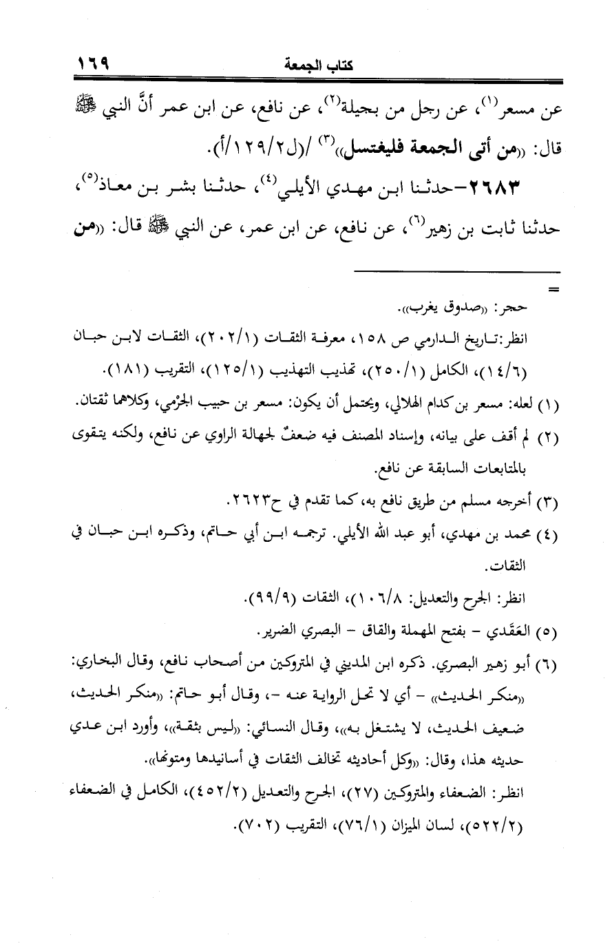 2683 - حدثنا ابن مهدي الأيلي (¬1)، حدثنا بشر بن معاذ (¬2)، حدثنا ثابت بن زهير (¬3)، عن نافع، عن ابن عمر، عن النبي -صلى الله عليه وسلم- قال: "من