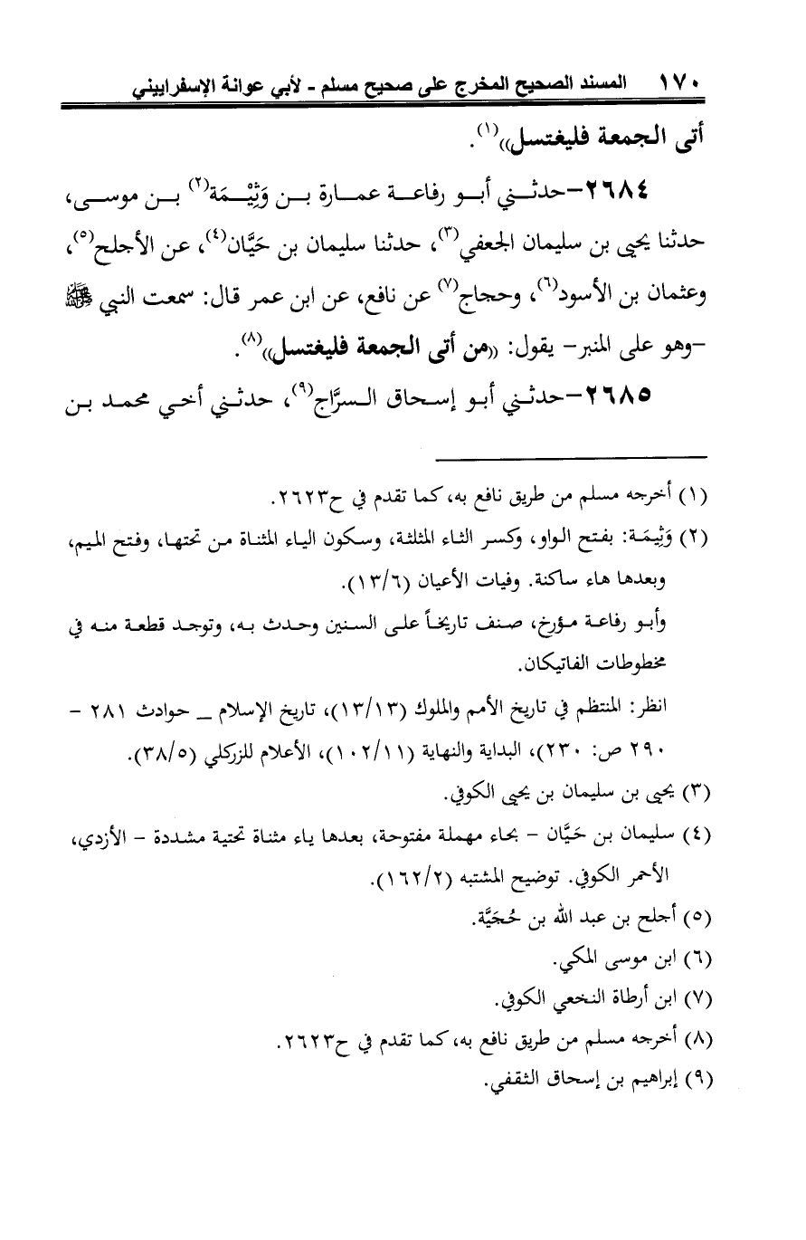 2684 - حدثني أَبو رفاعة عمارة بن وَثِيْمَة (¬1) بن موسى، حدثنا يحيى بن سليمان الجعفي (¬2)، حدثنا سليمان بن حَيَّان (¬3)، عن الأجلح (¬4)، وعثمان بن الأسود (¬5)، وحجاج (¬6) عن نافع، عن ابن عمر قال: سمعت النبي -صلى الله عليه وسلم-وهو على المنبر- يقول: "من أتى الجمعة فليغتسل" (¬7).
