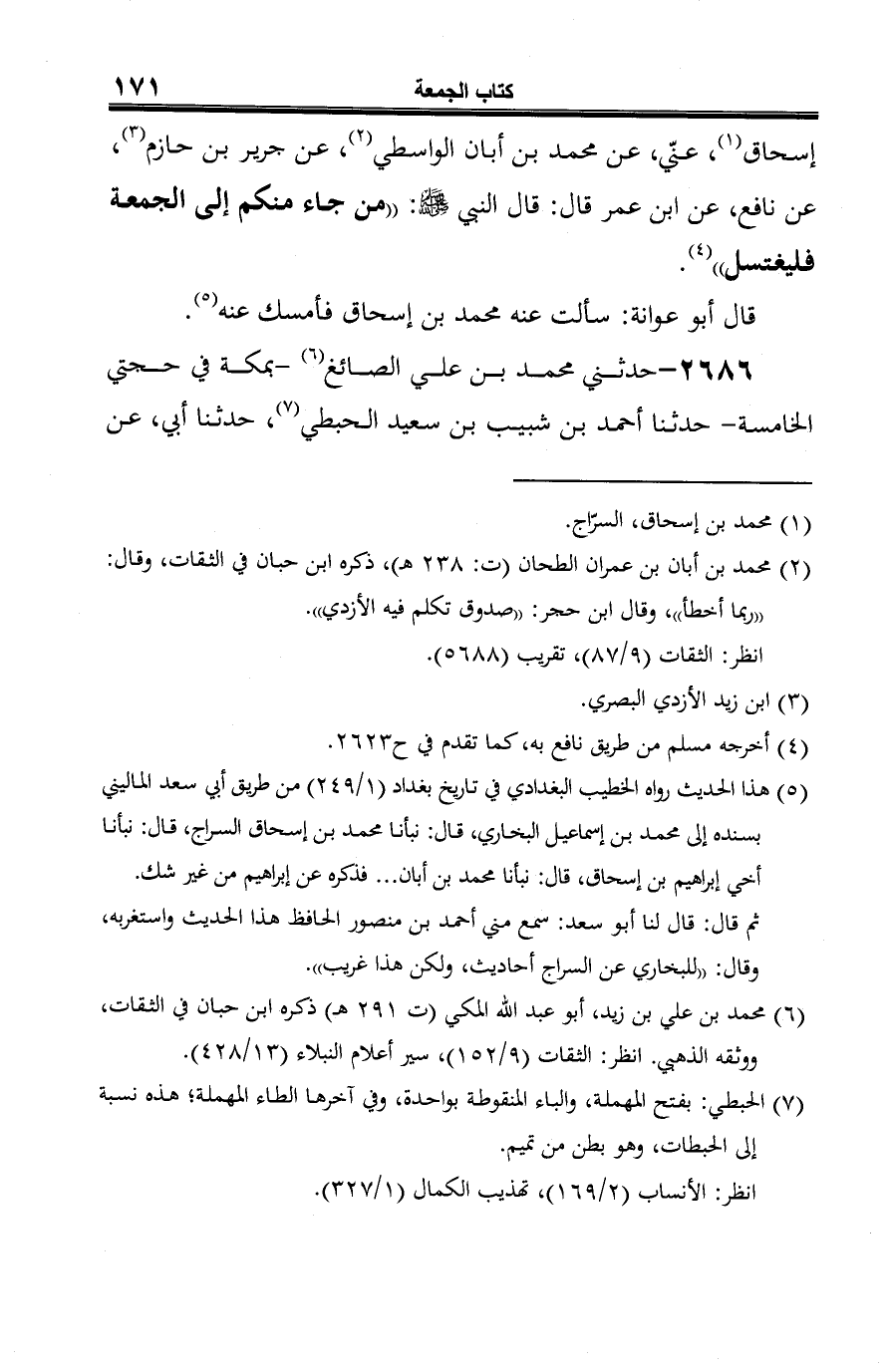 -[172]- يونس بن يزيد (¬3)، عن نافع، عن ابن عمر، قال: بينا رسول الله -صلى الله عليه وسلم- يخطب يوم الجمعة فقال في خطبته: "من جاء إلى الجمعة فليغتسل" (¬4).