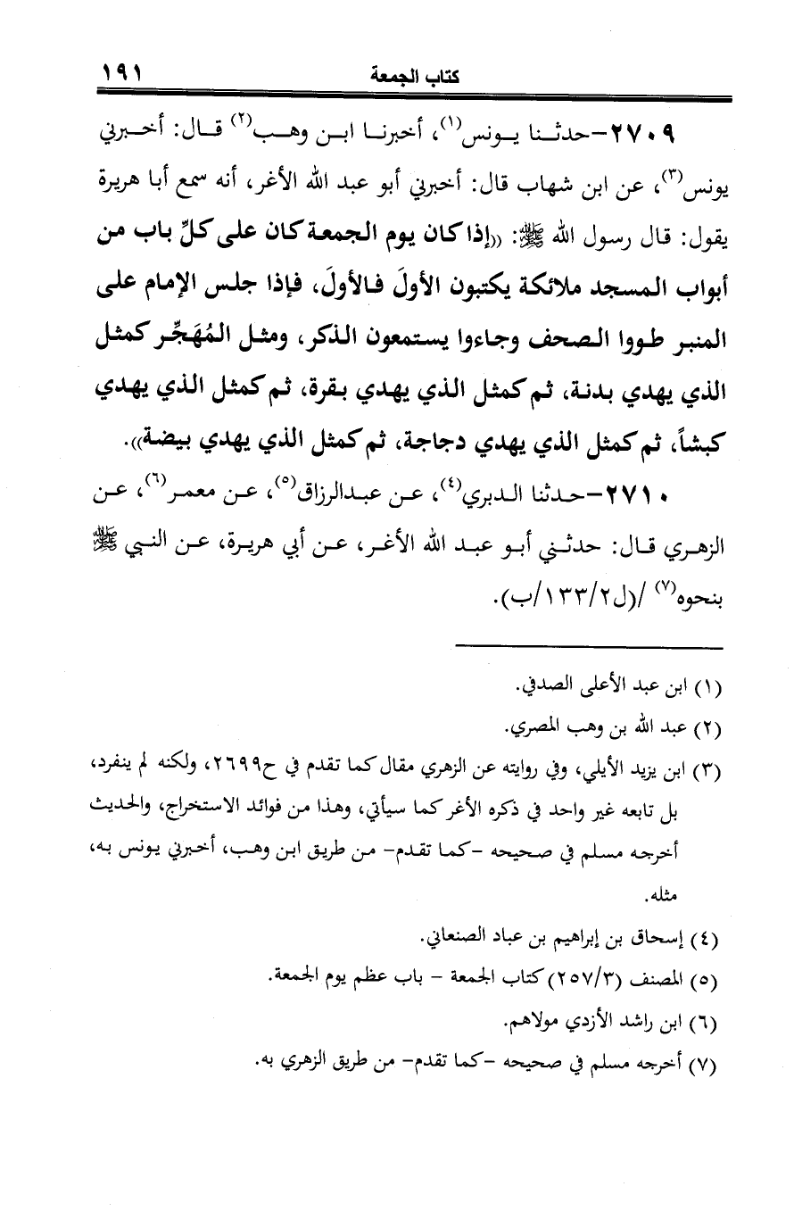 2709 - حدثنا يونس (¬1)، أخبرنا ابن وهب (¬2) قال: أخبرني يونس (¬3)، عن ابن شهاب قال: أخبرني أَبو عبد الله الأغر، أنه سمع أبا هريرة يقول: قال رسول الله -صلى الله عليه وسلم-: "إذا كان يوم الجمعة كان على كلِّ باب من أبواب المسجد ملائكة يكتبون الأولَ فالأولَ، فإذا جلس الإمام على المنبر طووا الصحف وجاءوا يستمعون الذكر، ومثل المُهَجِّر كمثل الذي يهدي بدنة، ثم كمثل الذي يهدي بقرة، ثم كمثل الذي يهدي كبشًا، ثم كمثل الذي يهدي دجاجة، ثم كمثل الذي يهدي بيضة".