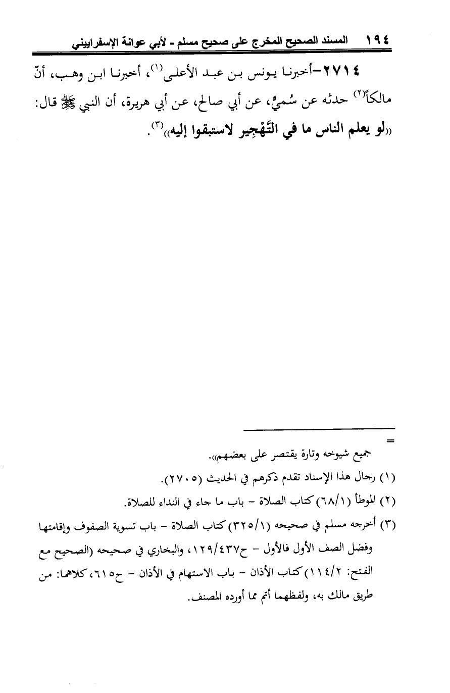 2714 - أخبرنا يونس بن عبد الأعلى (¬1)، أخبرنا ابن وهب، أنّ مالكًا (¬2) حدثه عن سُميٍّ، عن أبي صالح، عن أبي هريرة، أن النبي -صلى الله عليه وسلم- قال: "لو يعلم الناس ما في التَّهْجِير لاستبقوا إليه" (¬3).