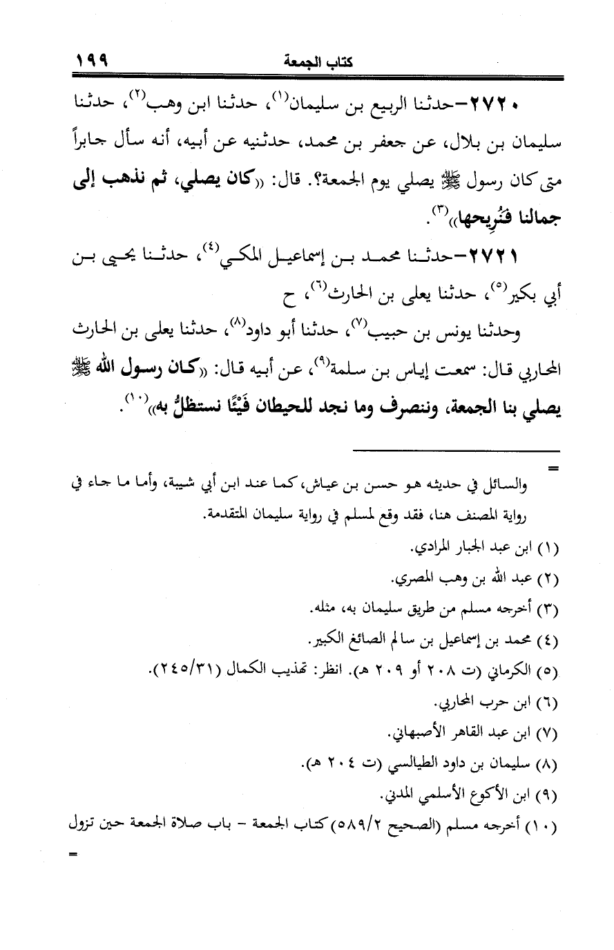 2720 - حدثنا الربيع بن سليمان (¬1)، حدثنا ابن وهب (¬2)، حدثنا سليمان بن بلال، عن جعفر بن محمد، حدثنيه عن أبيه، أنه سأل جابرًا متى كان رسول -صلى الله عليه وسلم- يصلي يوم الجمعة؟. قال: "كان يصلي، ثم نذهب إلى جمالنا فَنُرِيحها" (¬3).