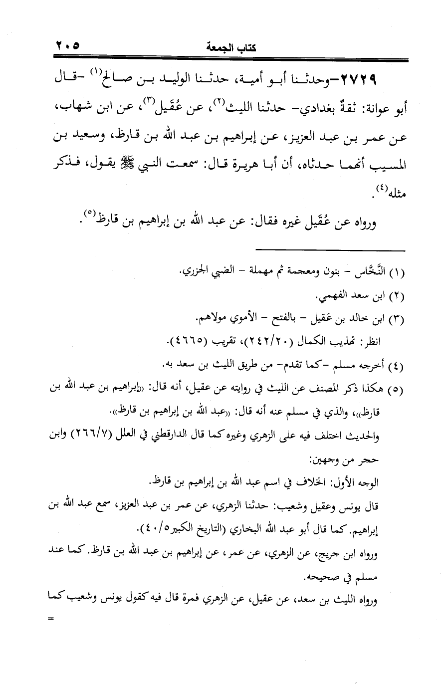 2729 - وحدثنا أَبو أمية، حدثنا الوليد بن صالح (¬1) -قال أَبو عوانة: ثقةٌ بغدادي- حدثنا الليث (¬2)، عن عُقَيل (¬3)، عن ابن شهاب، عن عمر بن عبد العزيز، عن إبراهيم بن عبد الله بن قارظ، وسعيد بن المسيب أنهما حدثاه، أن أبا هريرة قال: سمعت النبي -صلى الله عليه وسلم- يقول، فذكر مثله (¬4).
