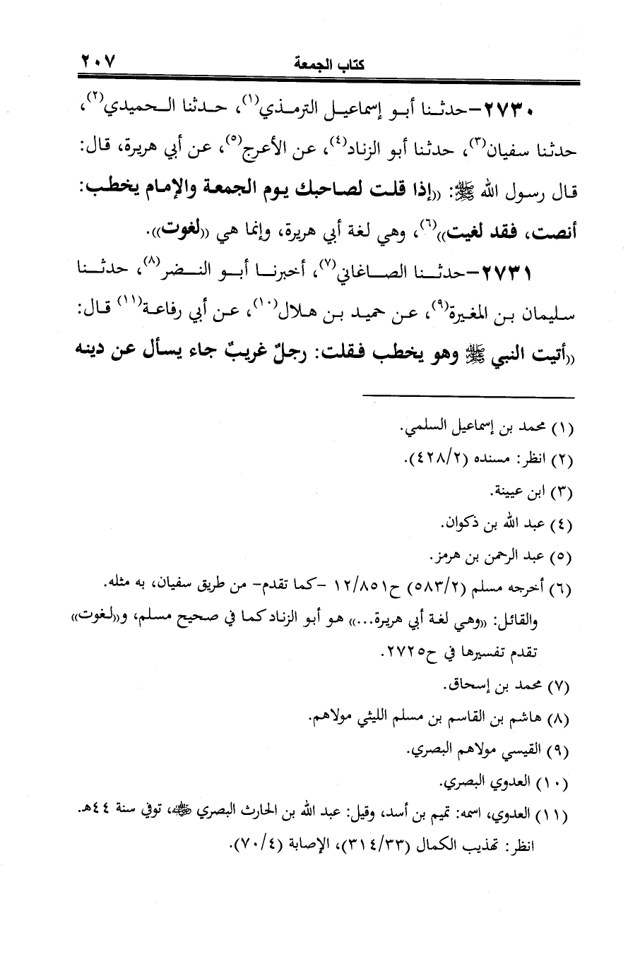 2730 - حدثنا أبو إسماعيل الترمذي (¬1)، حدثنا الحميدي (¬2)، حدثنا سفيان (¬3)، حدثنا أبو الزناد (¬4)، عن الأعرج (¬5)، عن أبي هريرة، قال: قال رسول الله -صلى الله عليه وسلم-: "إذا قلت لصاحبك يوم الجمعة والإمام يخطب: أنصت، فقد لغيت" (¬6)، وهي لغة أبي هريرة، وإنما هي "لغوت".