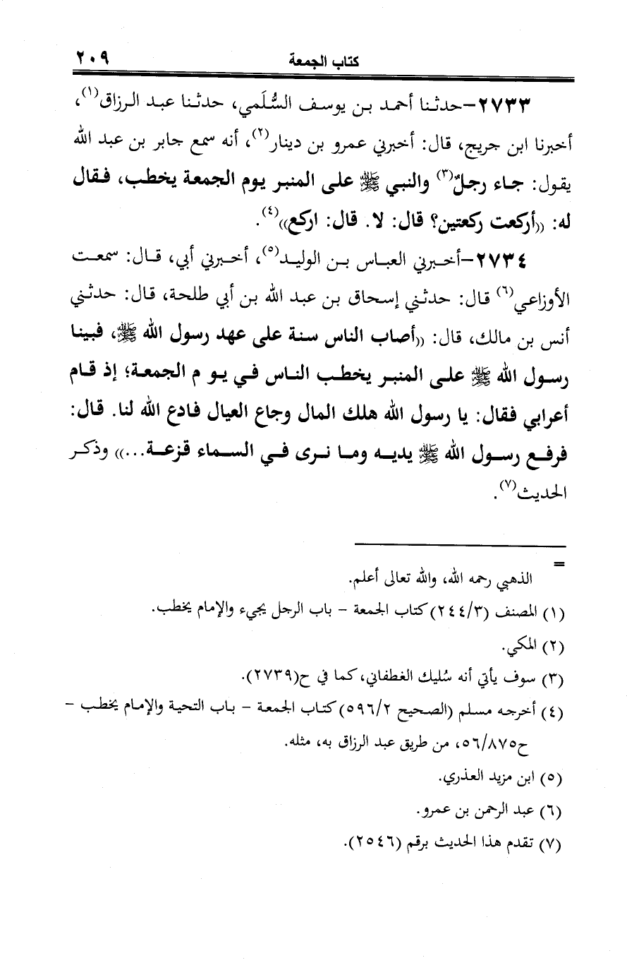2733 - حدثنا أحمد بن يوسف السُّلَمي، حدثنا عبد الرزاق (¬1)، أخبرنا ابن جريج، قال: أخبرني عمرو بن دينار (¬2)، أنه سمع جابر بن عبد الله يقول: جاء رجلٌ (¬3) والنبي -صلى الله عليه وسلم- على المنبر يوم الجمعة يخطب، فقال له: "أركعت ركعتين؟ قال: لا. قال: اركع" (¬4).