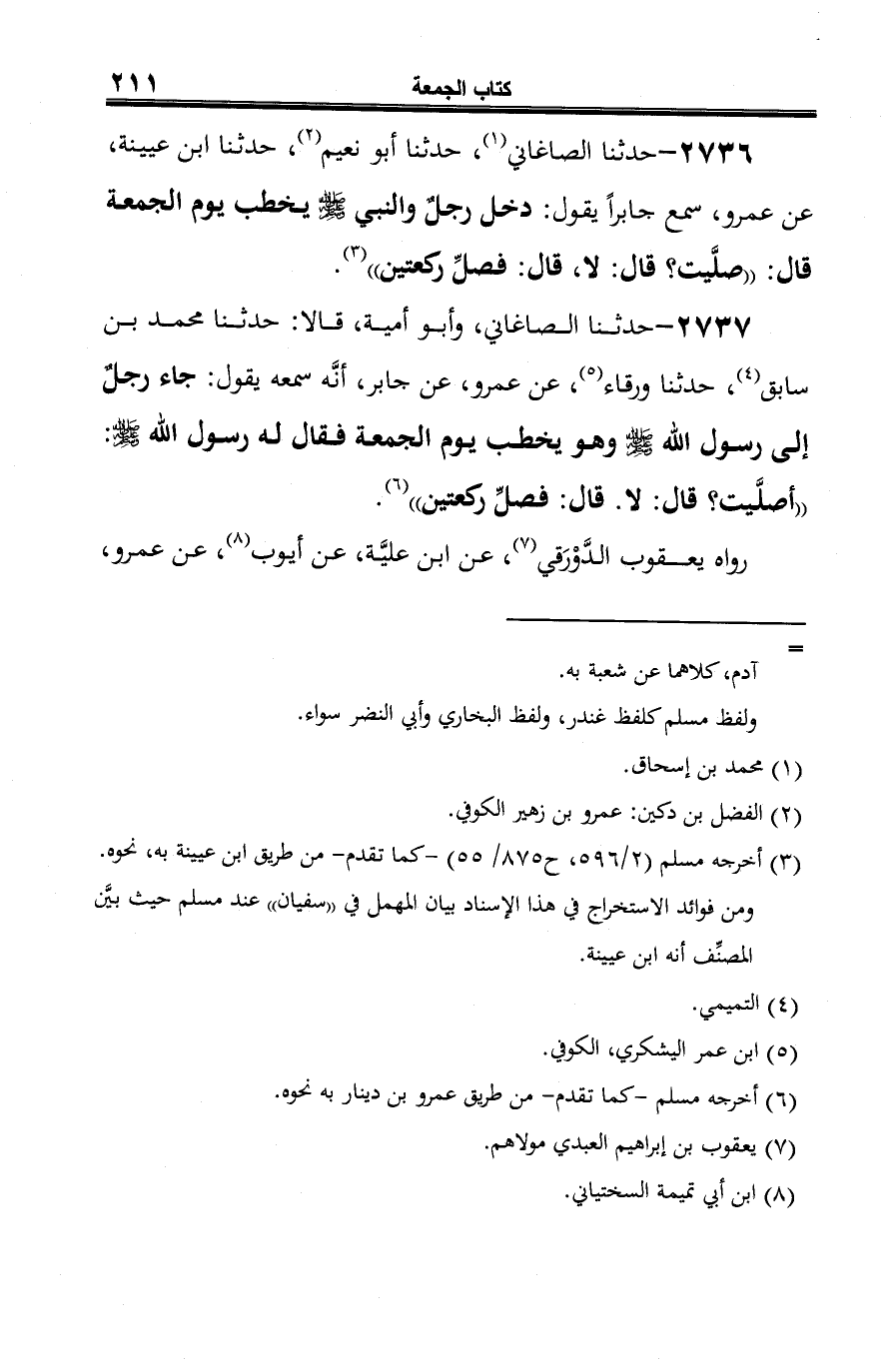 2736 - حدثنا الصاغاني (¬1)، حدثنا أبو نعيم (¬2)، حدثنا ابن عيينة، عن عمرو، سمع جابرًا يقول: دخل رجلٌ والنبي -صلى الله عليه وسلم- يخطب يوم الجمعة قال: "صلَّيت؟ قال: لا، قال: فصلِّ ركعتين" (¬3).
