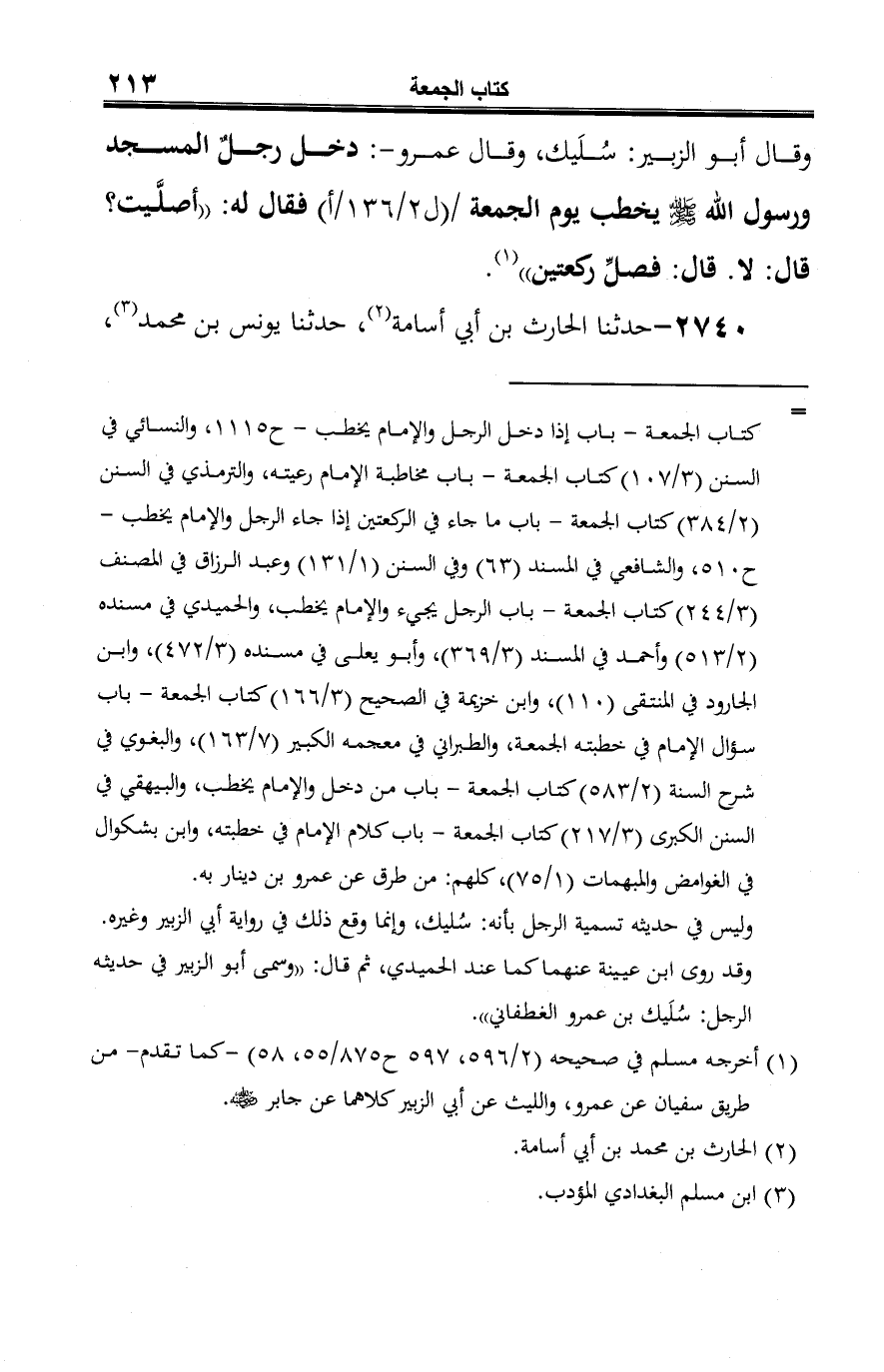 -[214]- حدثنا الليث بن سعد (¬3)، عن أبي الزبير، عن جابر قال: جاء سُلَيك الغَطَفاني يوم الجمعة ورسول الله -صلى الله عليه وسلم- على المنبر، فقعد سُلَيك قبل أن يصلي، فقال له رسول الله -صلى الله عليه وسلم-: "أركعت ركعتين؟ قال: لا، قال: قم فاركعهما" (¬4).