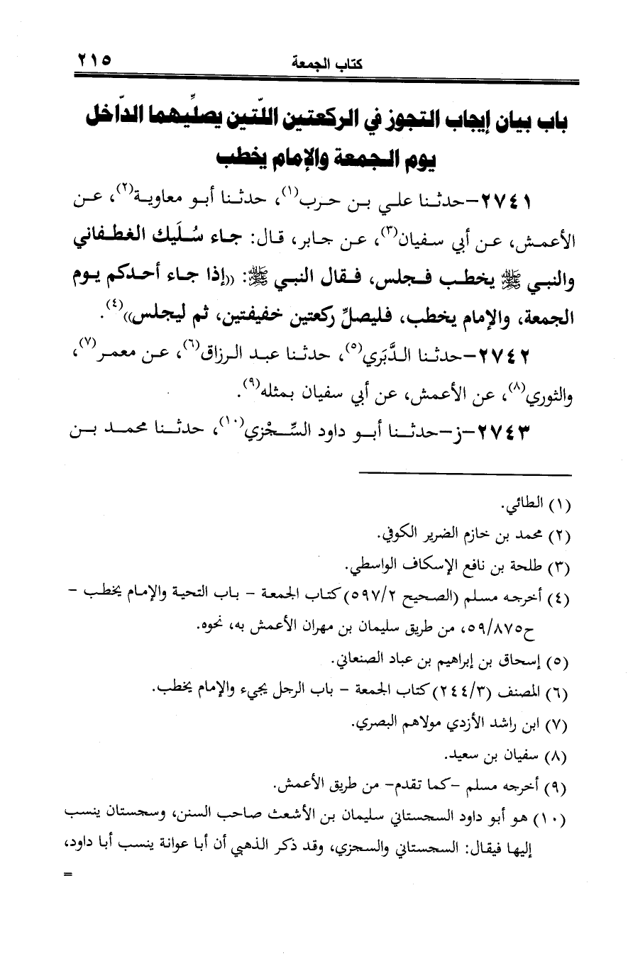 2741 - حدثنا علي بن حرب (¬1)، حدثنا أبو معاوية (¬2)، عن الأعمش، عن أبي سفيان (¬3)، عن جابر، قال: جاء سُلَيك الغطفاني والنبي -صلى الله عليه وسلم- يخطب فجلس، فقال النبي -صلى الله عليه وسلم-: "إذا جاء أحدكم يوم الجمعة، والإمام يخطب، فليصلِّ ركعتين خفيفتين، ثم ليجلس" (¬4).