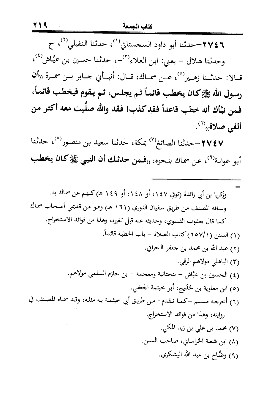 2746 - حدثنا أبو داود السجستاني (¬1)، حدثنا النفيلي (¬2)، ح وحدثنا هلال -يعني: ابن العلاء (¬3) -، حدثنا حسين بن عيَّاش (¬4)، قالا: حدثنا زهير (¬5)، عن سماك، قال: أنبأني جابر بن سمرة "أن رسول الله -صلى الله عليه وسلم- كان يخطب قائمًا ثم يجلس، ثم يقوم فيخطب قائمًا، فمن نبَّأك أنه خطب قاعدًا فقد كذب! فقد والله صلَّيت معه أكثر من ألفي صلاة" (¬6).