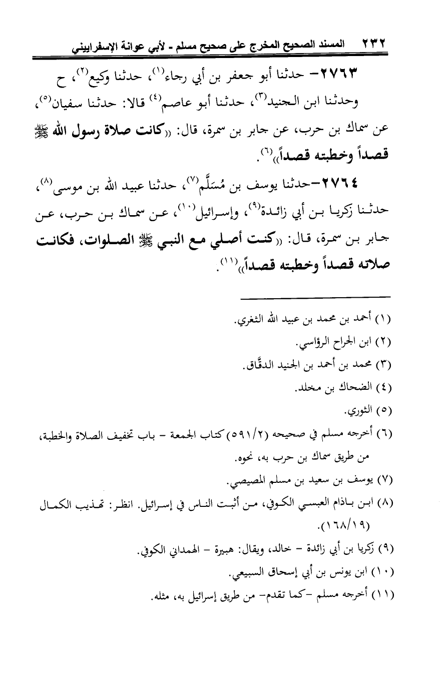 2764 - حدثنا يوسف بن مُسَلَّم (¬1)، حدثنا عبيد الله بن موسى (¬2)، حدثنا زكريا بن أبي زائدة (¬3)، وإسرائيل (¬4)، عن سماك بن حرب، عن جابر بن سمرة، قال: "كنت أصلي مع النبي -صلى الله عليه وسلم- الصلوات، فكانت صلاته قصدًا وخطبته قصدًا" (¬5).