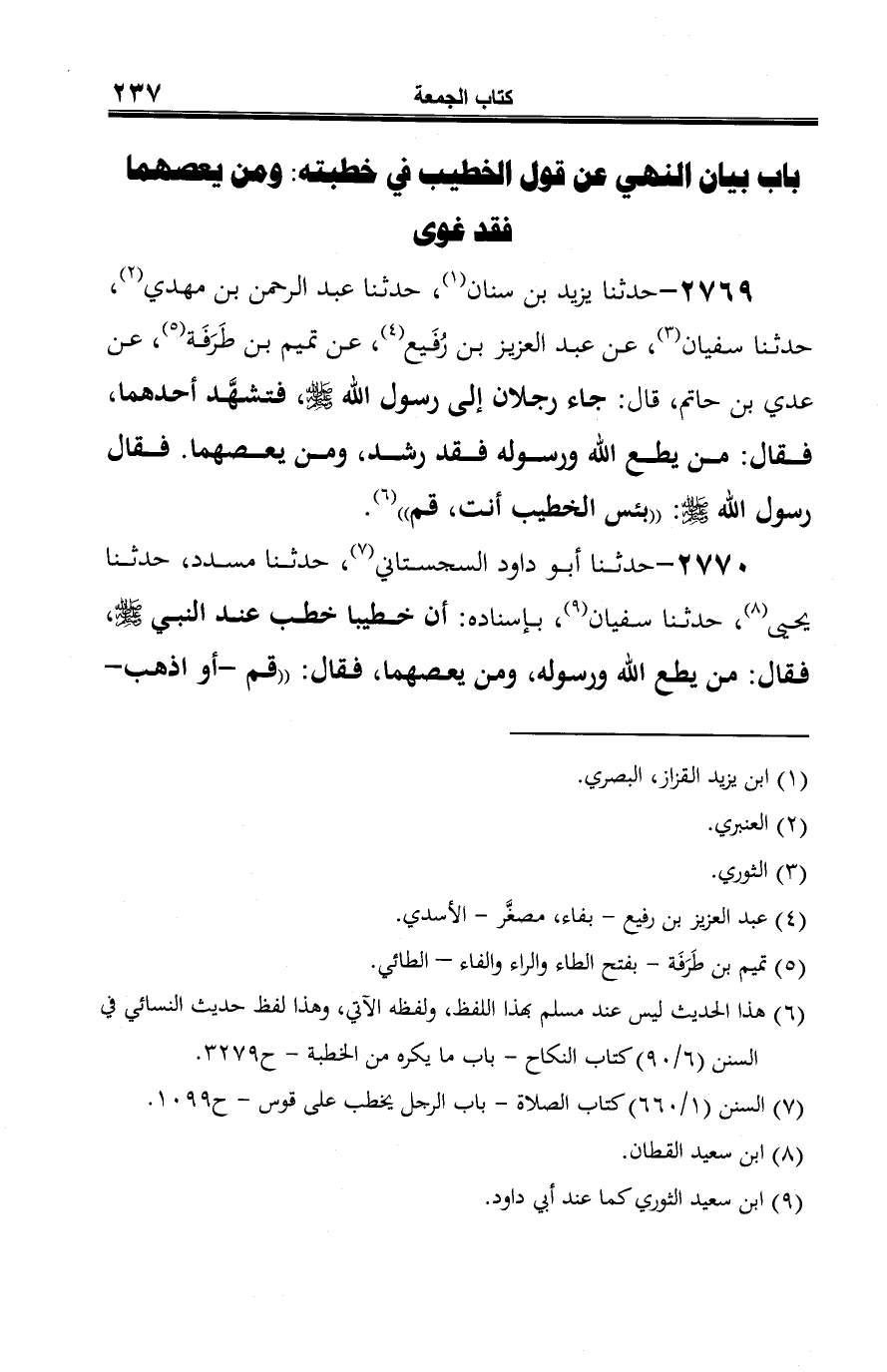 2769 - حدثنا يزيد بن سنان (¬1)، حدثنا عبد الرحمن بن مهدي (¬2)، حدثنا سفيان (¬3)، عن عبد العزيز بن رُفَيع (¬4)، عن تميم بن طَرَفَة (¬5)، عن عدي بن حاتم، قال: جاء رجلان إلى رسول الله -صلى الله عليه وسلم-، فتشهَّد أحدهما، فقال: من يطع الله ورسوله فقد رشد، ومن يعصهما. فقال رسول الله -صلى الله عليه وسلم-: "بئس الخطيب أنت، قم" (¬6).