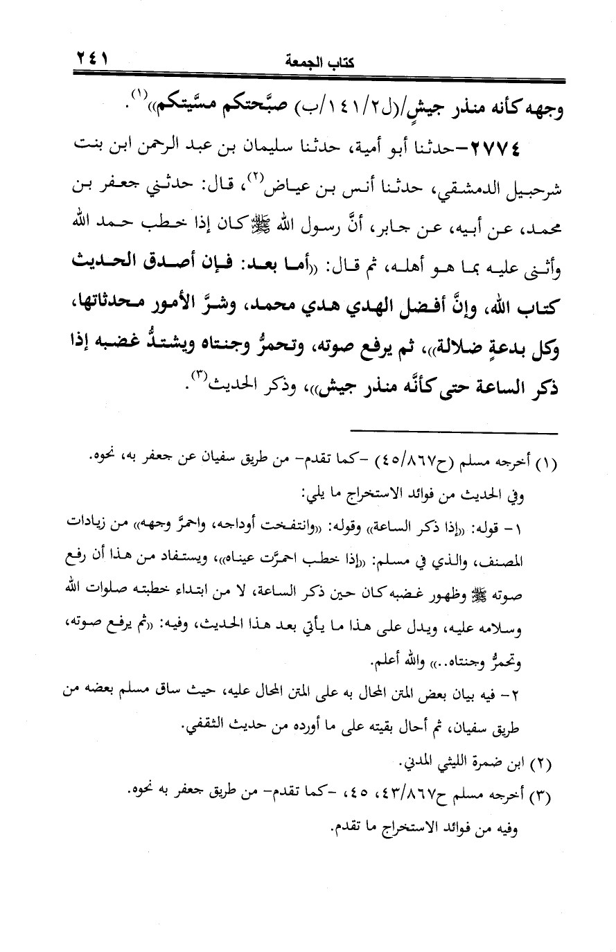 2774 - حدثنا أبو أمية، حدثنا سليمان بن عبد الرحمن ابن بنت شرحبيل الدمشقي، حدثنا أنس بن عياض (¬1)، قال: حدثني جعفر بن محمد، عن أبيه، عن جابر، أنَّ رسول الله -صلى الله عليه وسلم- كان إذا خطب حمد الله وأثنى عليه بما هو أهله، ثم قال: "أما بعد: فإن أصدق الحديث كتاب الله، وإنَّ أفضل الهدي هدي محمد، وشرَّ الأمور محدثاتها، وكل بدعةٍ ضلالة"، ثم يرفع صوته، وتحمرُّ وجنتاه ويشتدُّ غضبه إذا ذكر الساعة حتى كأنَّه منذر جيش"، وذكر الحديث (¬2).