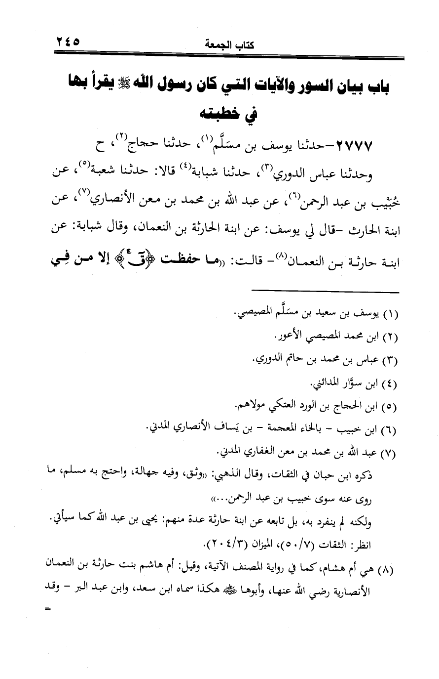 وحدثنا عباس الدوري (¬3)، حدثنا شبابة (¬4) قالا: حدثنا شعبة (¬5)، عن خُبَيْب بن عبد الرحمن (¬6)، عن عبد الله بن محمد بن معن الأنصاري (¬7)، عن ابنة الحارث -قال لي يوسف: عن ابنة الحارثة بن النعمان، وقال شبابة: عن ابنة حارثة بن النعمان (¬8) - قالت: "ما حفظت {ق} إلا من في