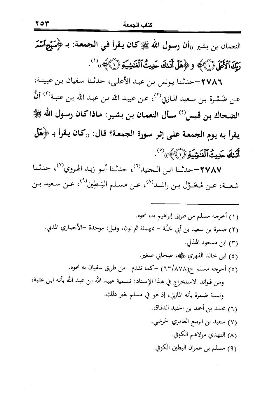 2786 - حدثنا يونس بن عبد الأعلى، حدثنا سفيان بن عيينة، عن ضَمْرة بن سعيد المازني (¬1)، عن عبيد الله بن عبد الله بن عتبة (¬2) أنَّ الضحاك بن قيس (¬3) سأل النعمان بن بشير: ماذا كان رسول الله -صلى الله عليه وسلم- يقرأ به يوم الجمعة على إثر سورة الجمعة؟ قال: "كان يقرأ بـ {هَلْ أَتَاكَ حَدِيثُ الْغَاشِيَةِ} " (¬4).