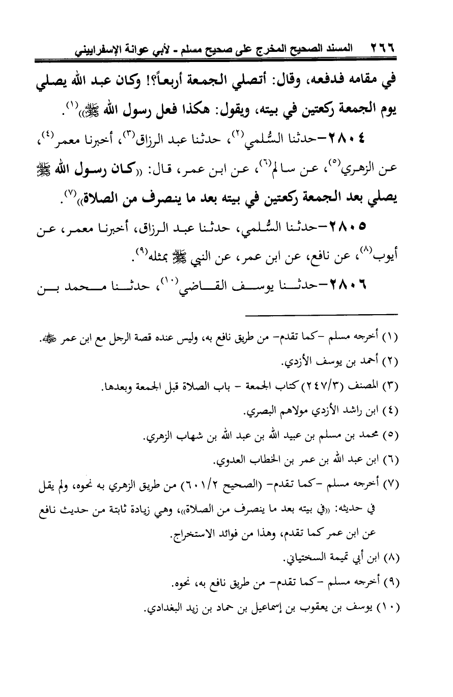 2804 - حدثنا السُّلمي (¬1)، حدثنا عبد الرزاق (¬2)، أخبرنا معمر (¬3)، عن الزهري (¬4)، عن سالم (¬5)، عن ابن عمر، قال: "كان رسول الله -صلى الله عليه وسلم- يصلي بعد الجمعة ركعتين في بيته بعد ما ينصرف من الصلاة" (¬6).