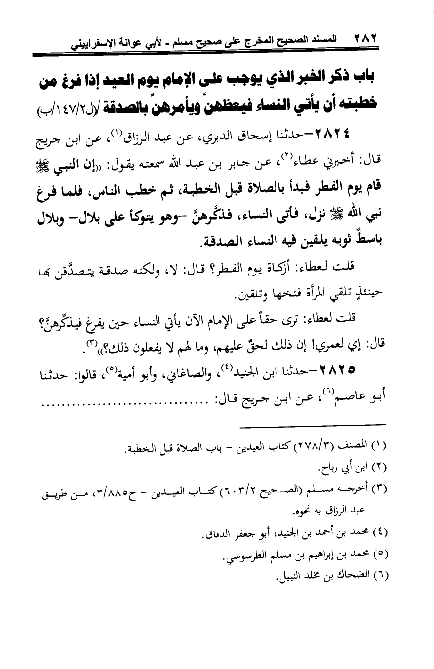 2824 - حدثنا إسحاق الدبري، عن عبد الرزاق (¬1)، عن ابن جريج قال: أخبرني عطاء (¬2)، عن جابر بن عبد الله سمعته يقول: "إن النبي -صلى الله عليه وسلم- قام يوم الفطر فبدأ بالصلاة قبل الخطبة، ثم خطب الناس، فلما فرغ نبي الله -صلى الله عليه وسلم- نزل، فأتى النساء، فذكَّرهنَّ -وهو يتوكأ على بلال- وبلال باسطٌ ثوبه يلقين فيه النساء الصدقة.