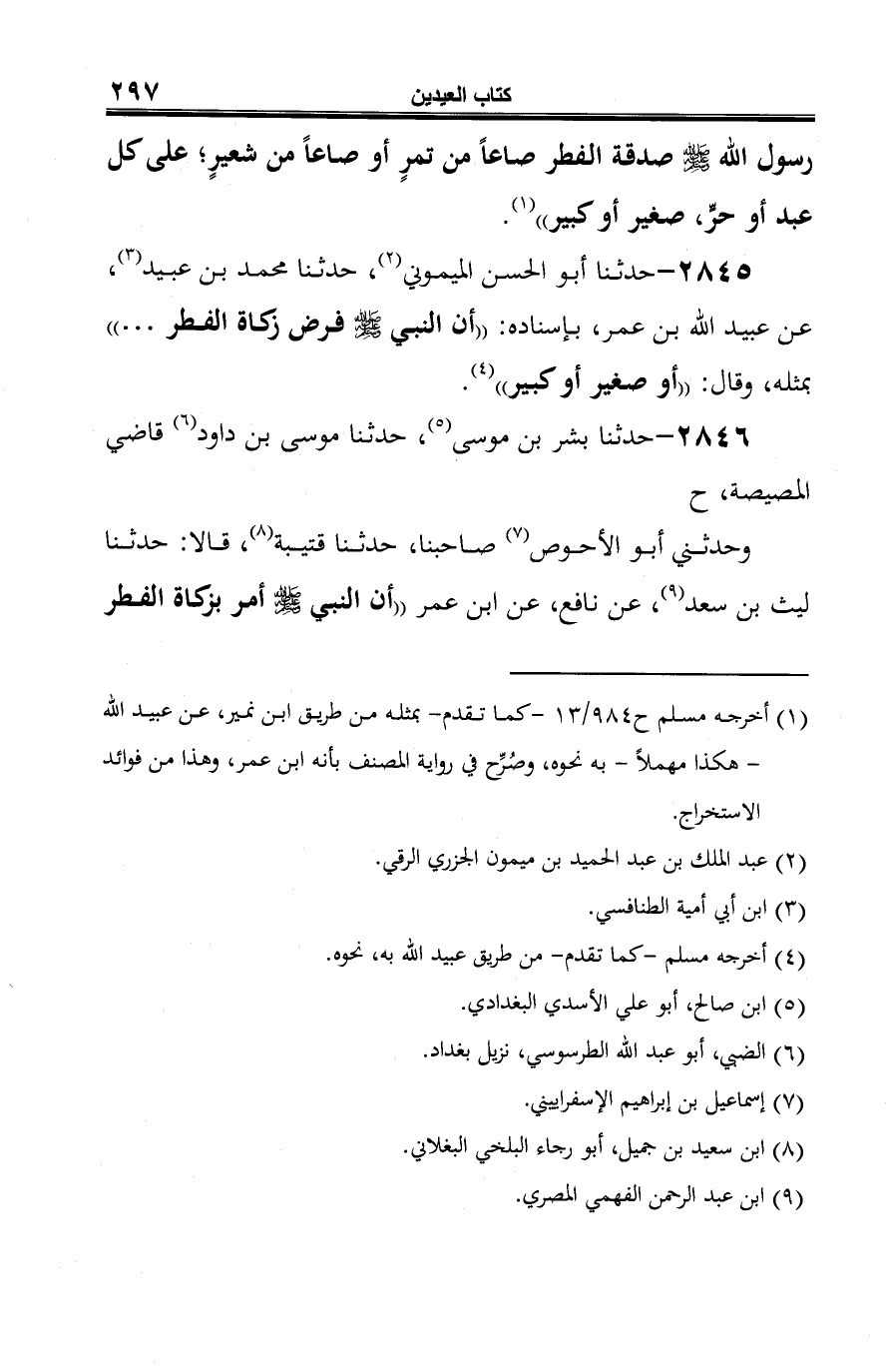 2845 - حدثنا أبو الحسن الميموني (¬1)، حدثنا محمد بن عبيد (¬2)، عن عبيد الله بن عمر، بإسناده: "أن النبي -صلى الله عليه وسلم- فرض زكاة الفطر. . ." بمثله، وقال: "أو صغير أو كبير" (¬3).